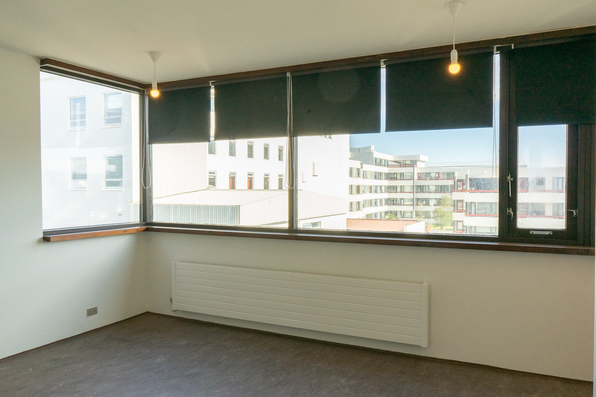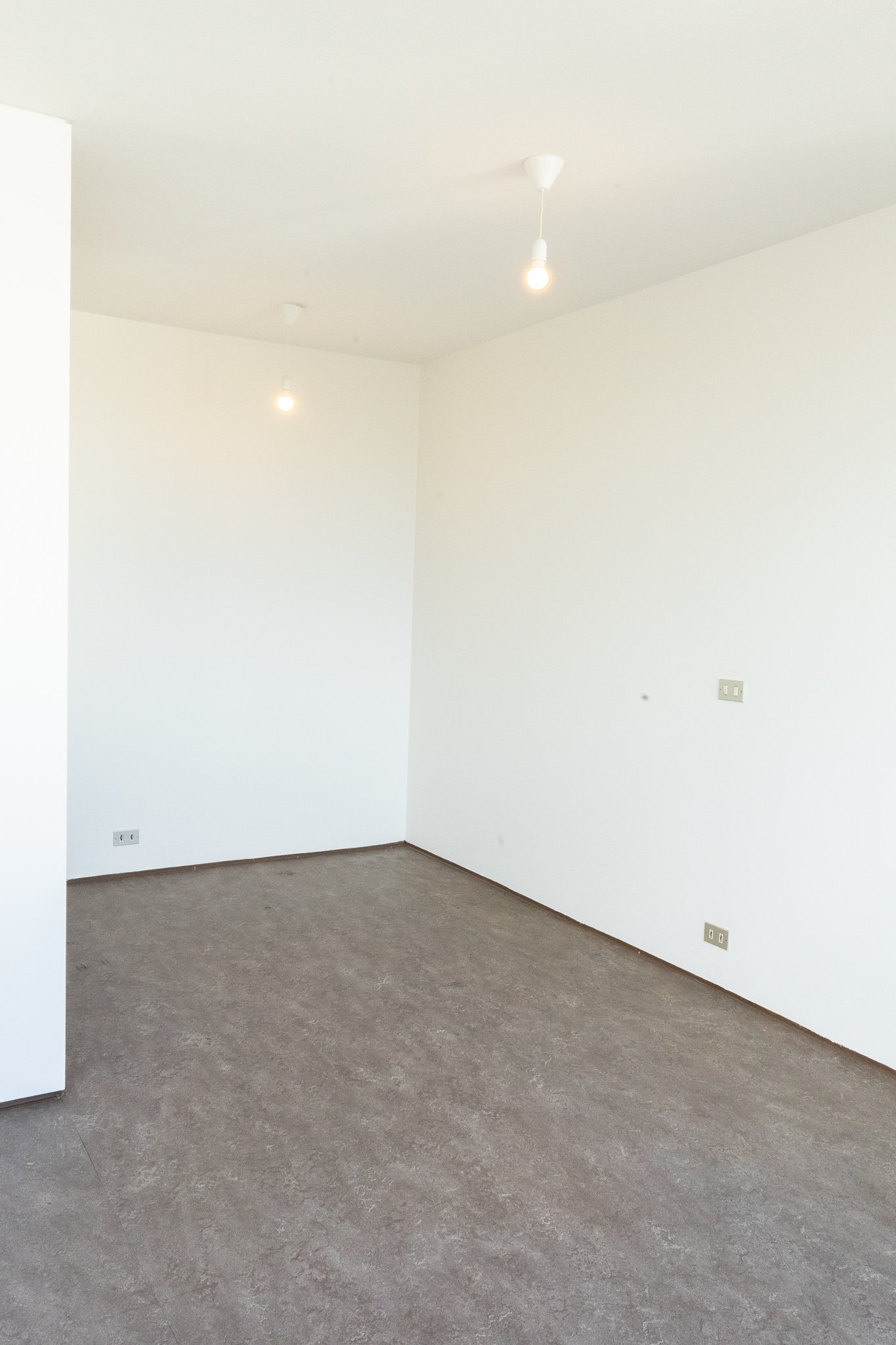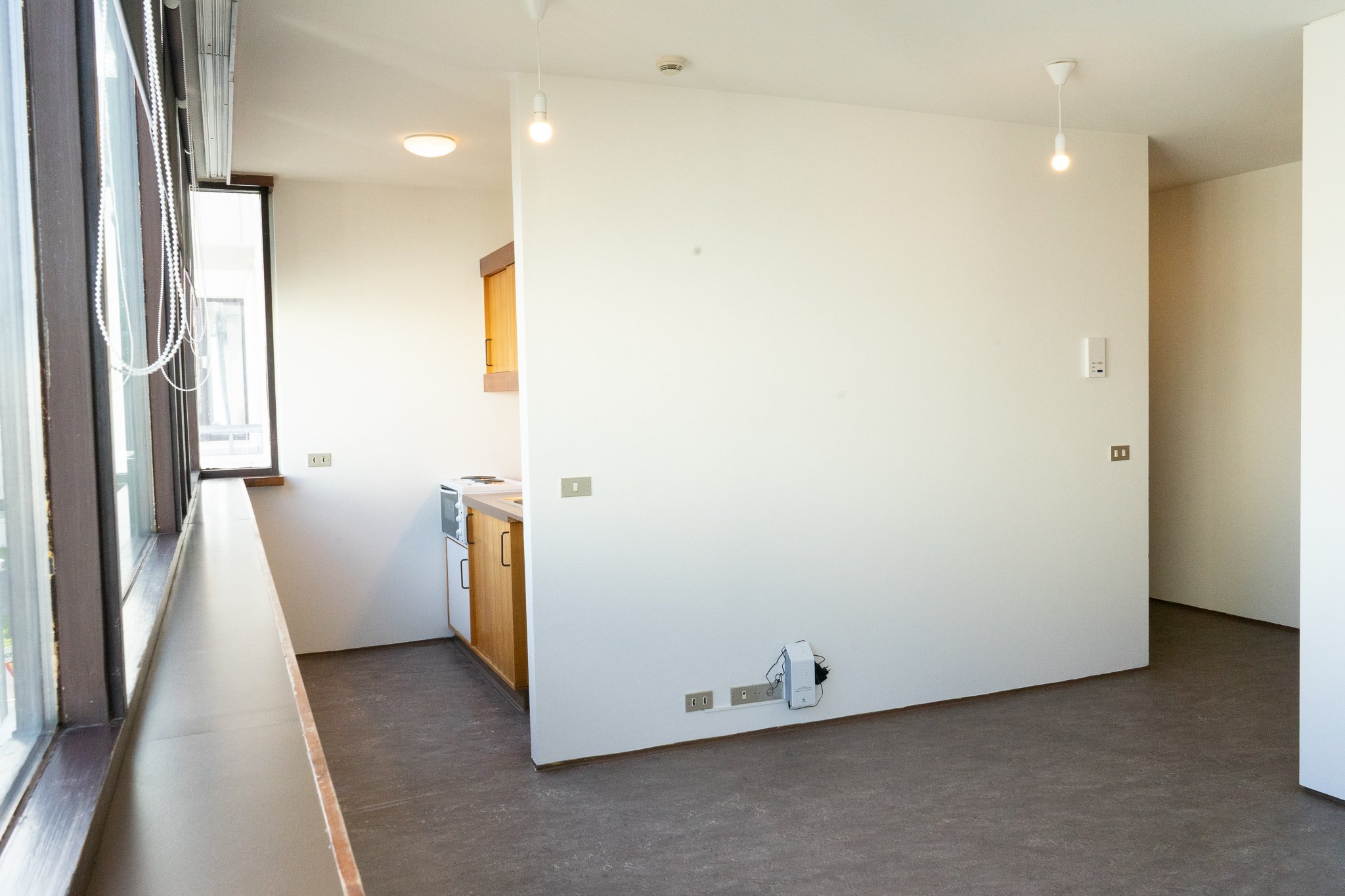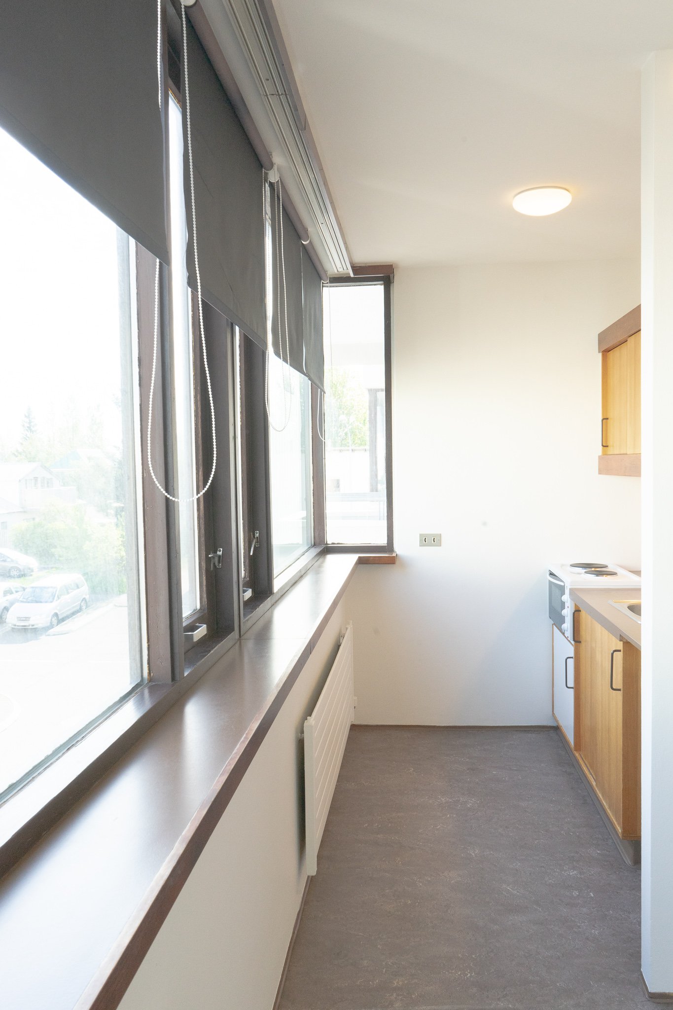 Íbúðin er hvítmáluð og dúkur er á gólfi, eldhúsaðstaða og stórir gluggar með góðu útsýni.