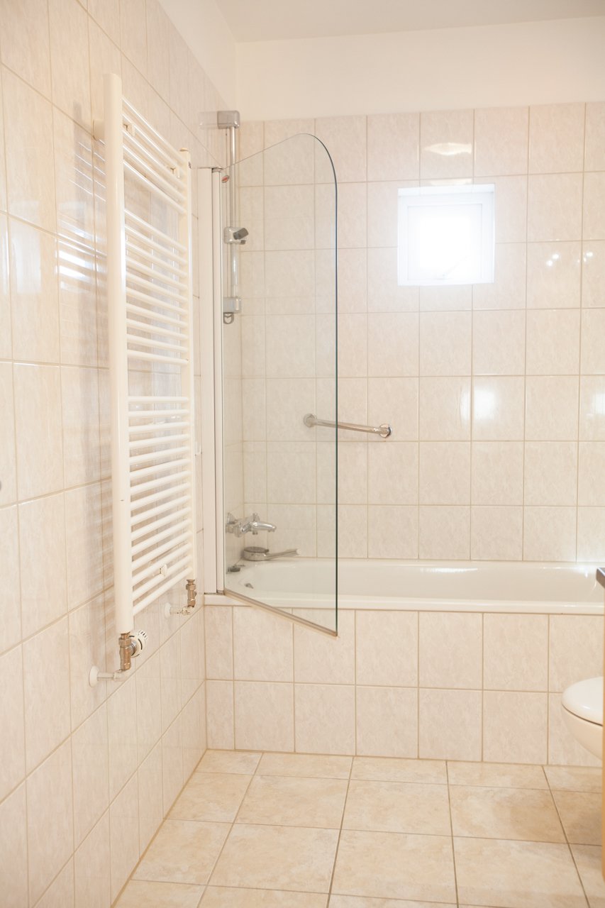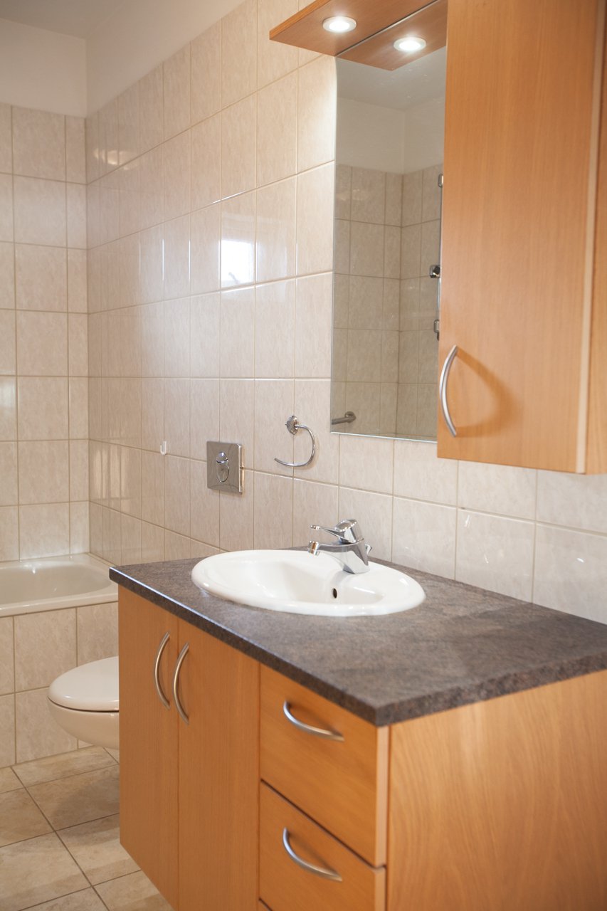 Bað með flísum á gólfi og veggjum. Góð innrétting, þvottahús og geymsla með flísum á gólfum.
