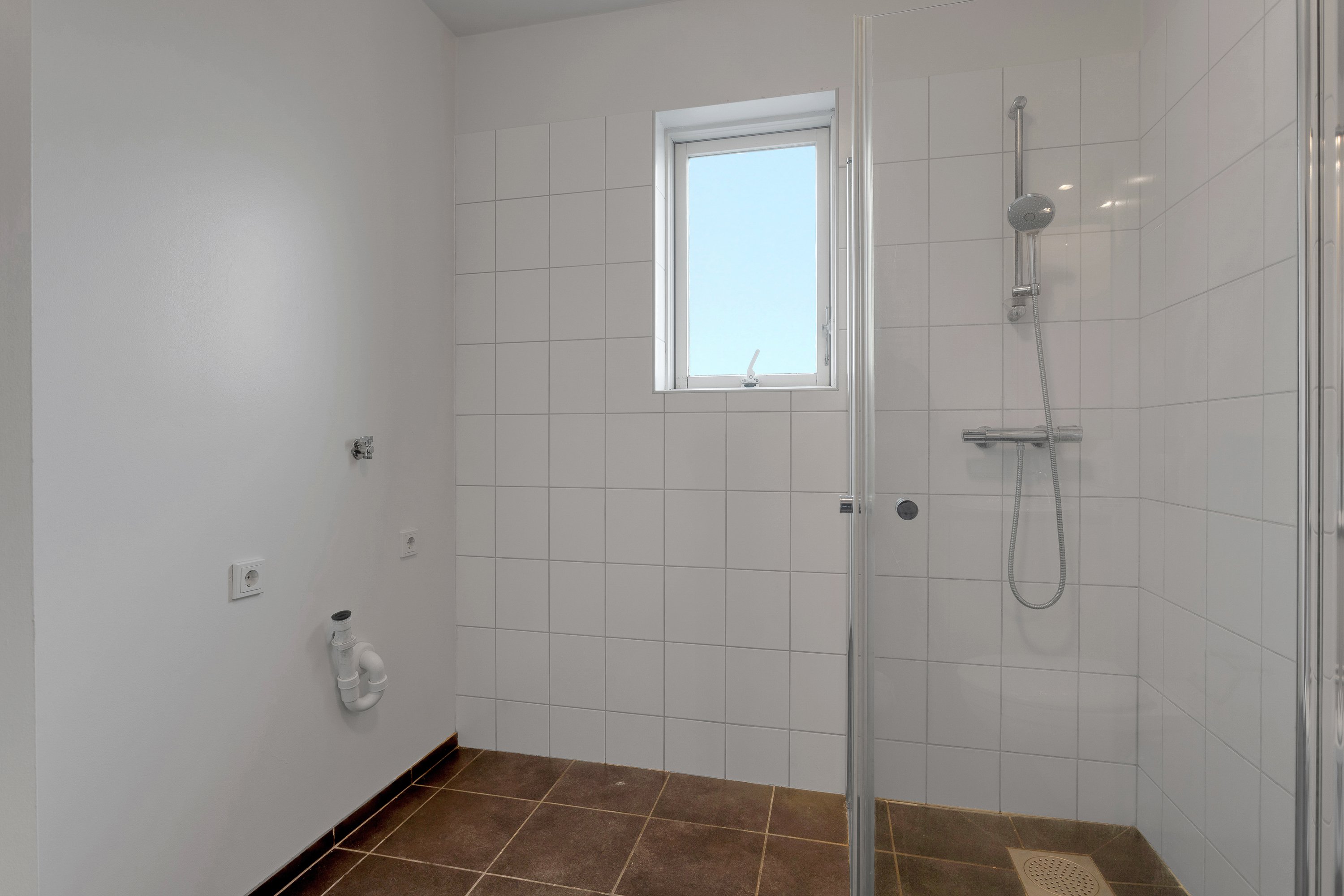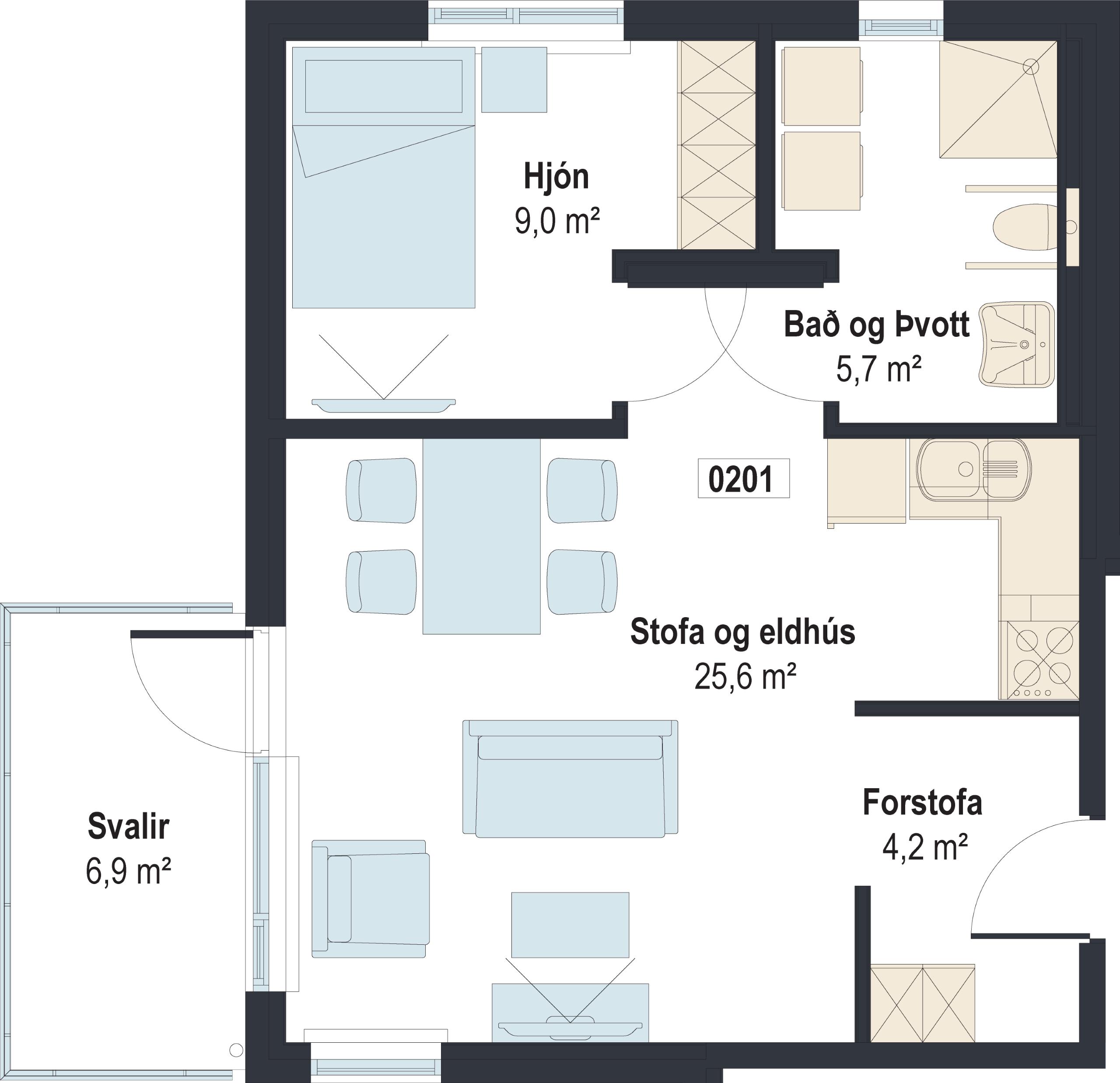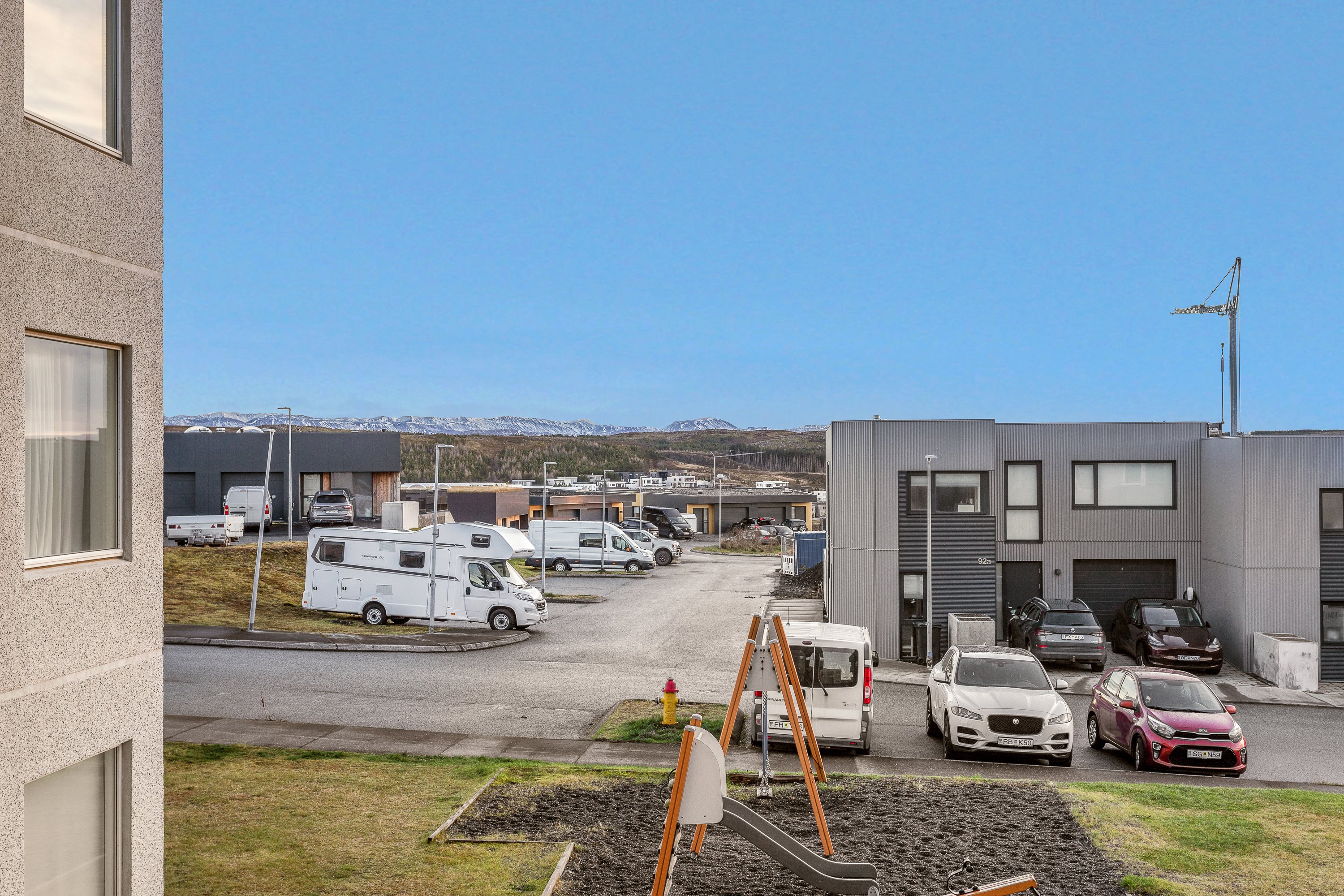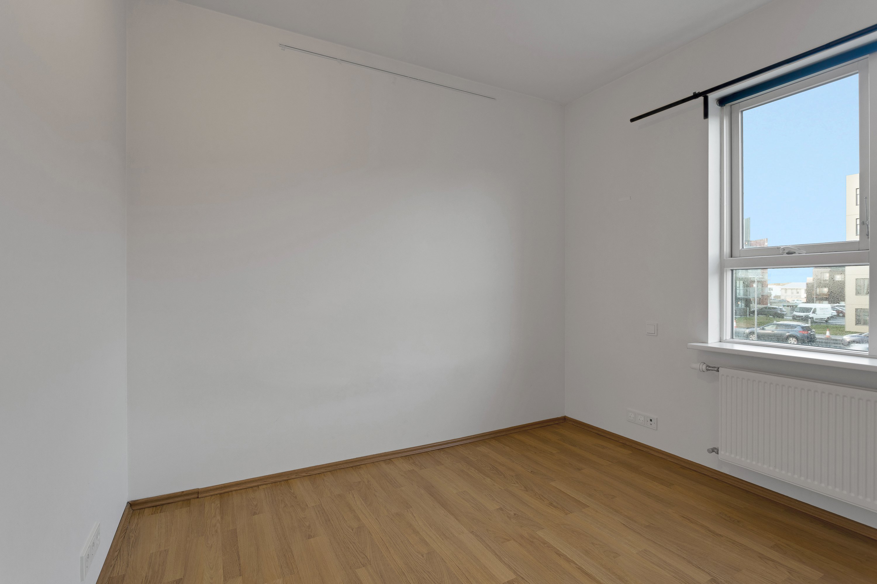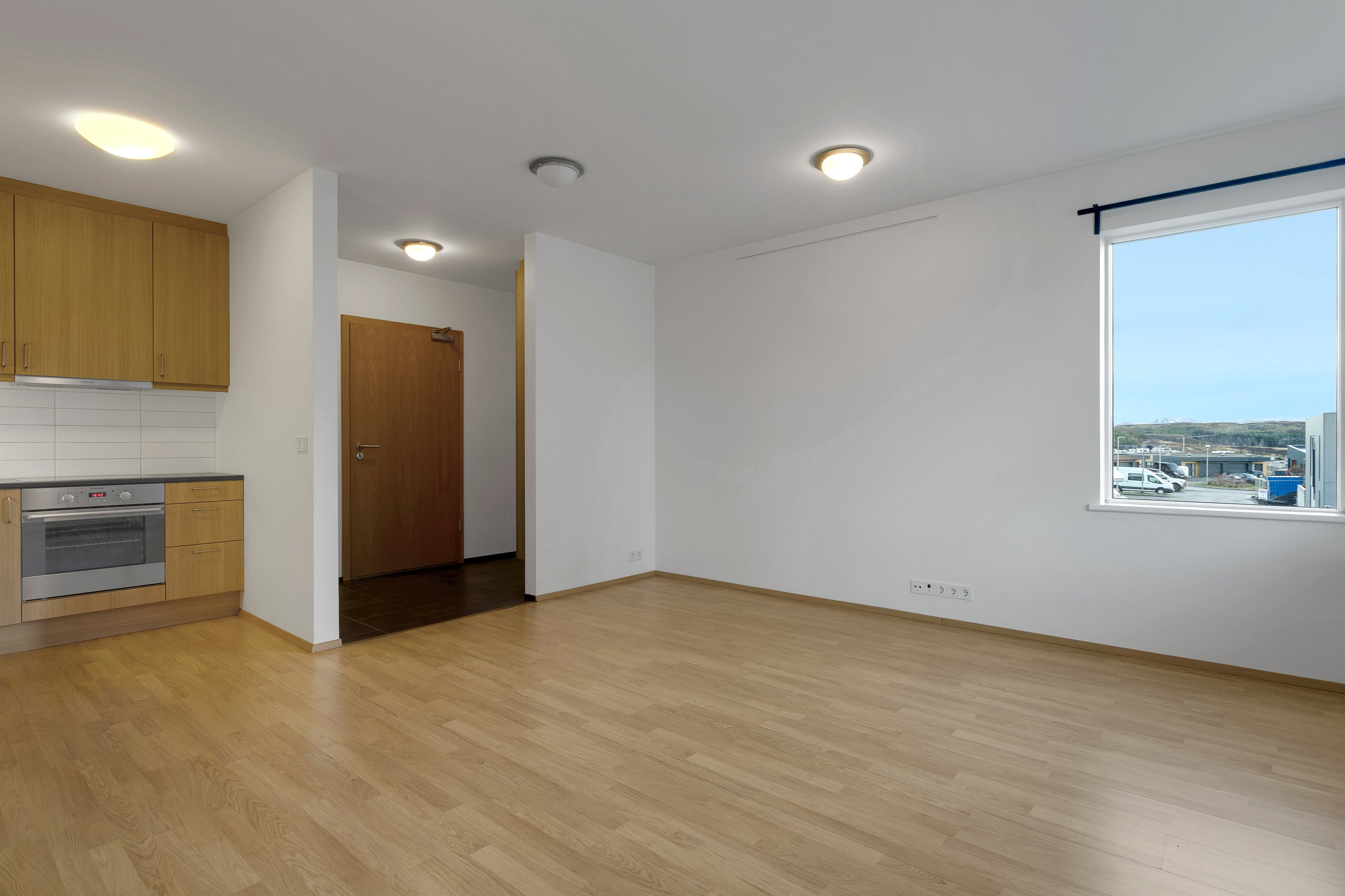 Íbúðin skiptist í svefnherbergi með fataskáp, rúmgóða og bjarta stofu með samliggjandi eldhúsi og baðherbergi með sturtu og tengi fyrir þvottvél.