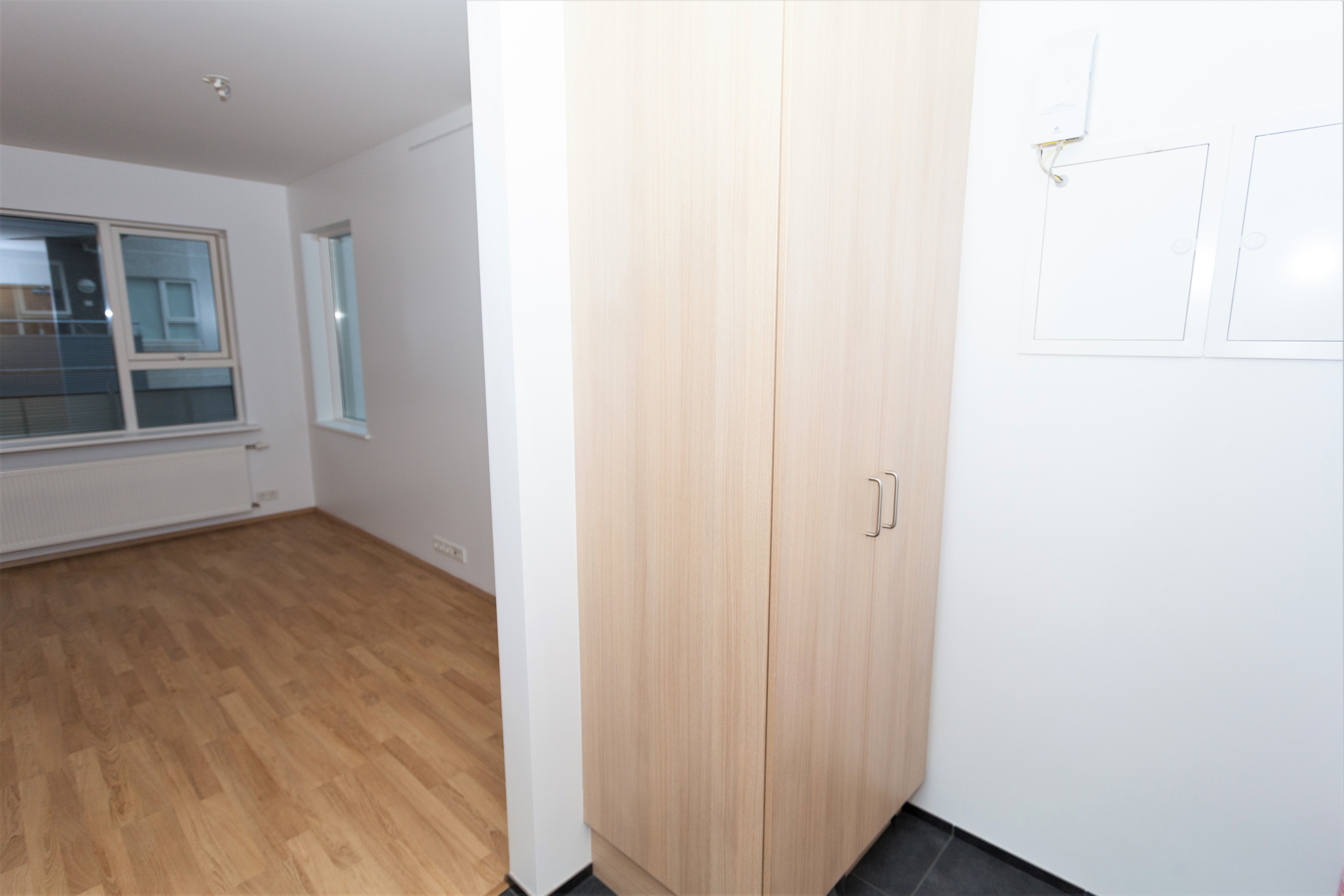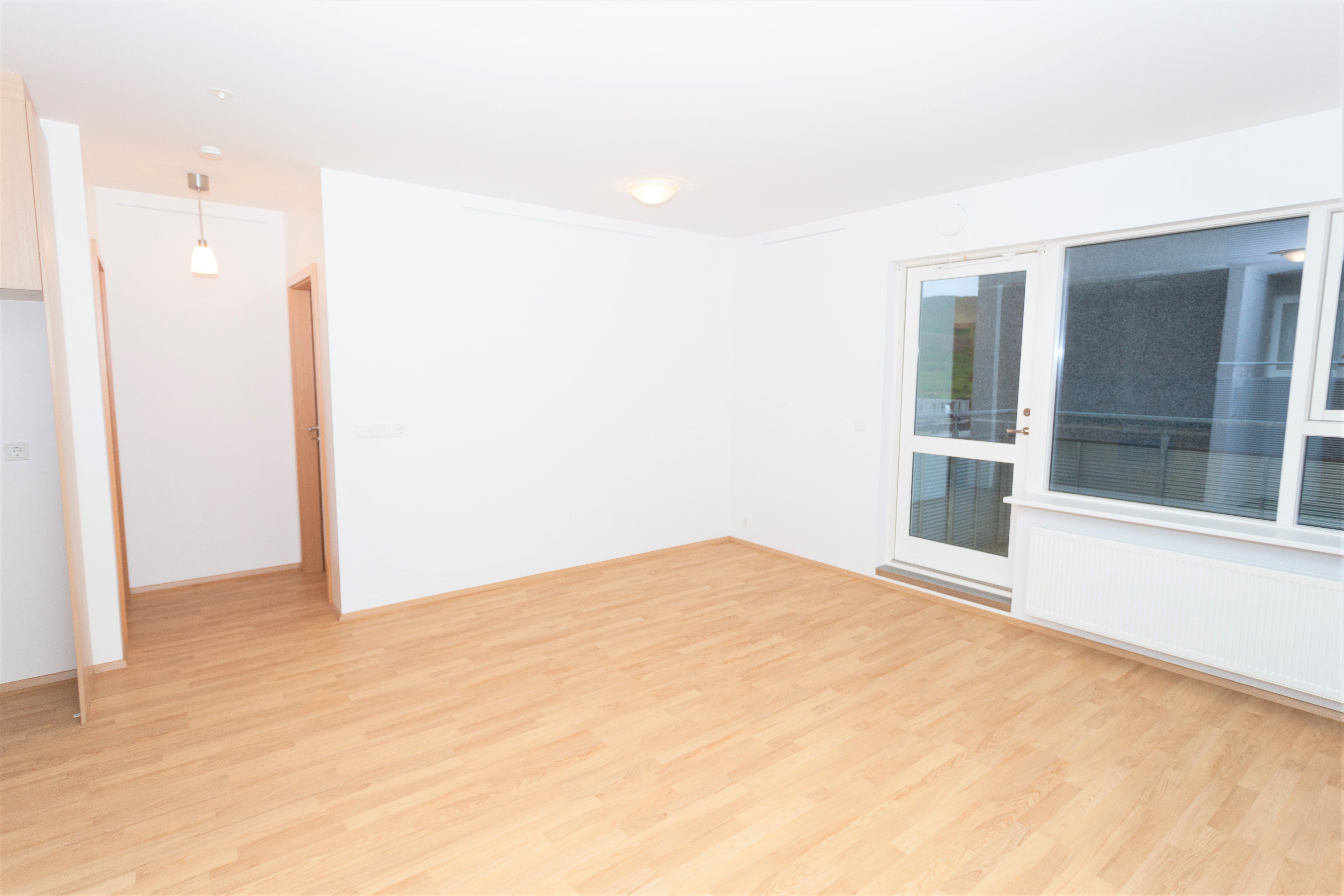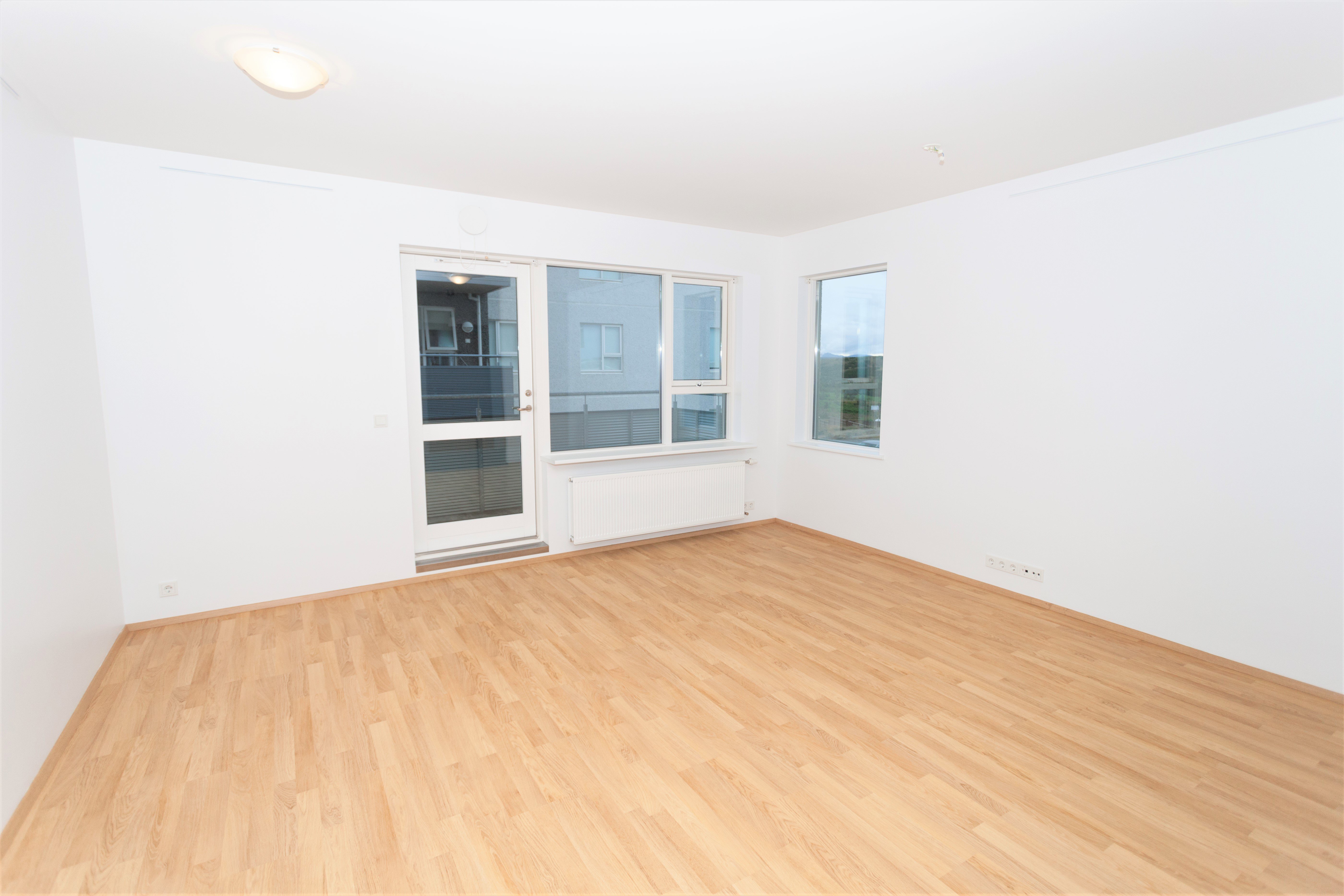 Íbúðin skiptist í eitt svefnherbergi með fataskáp, rúmgóða og bjarta stofu með samliggjandi eldhúsi og baðherbergi með sturtu og tengi fyrir þvottvél.
