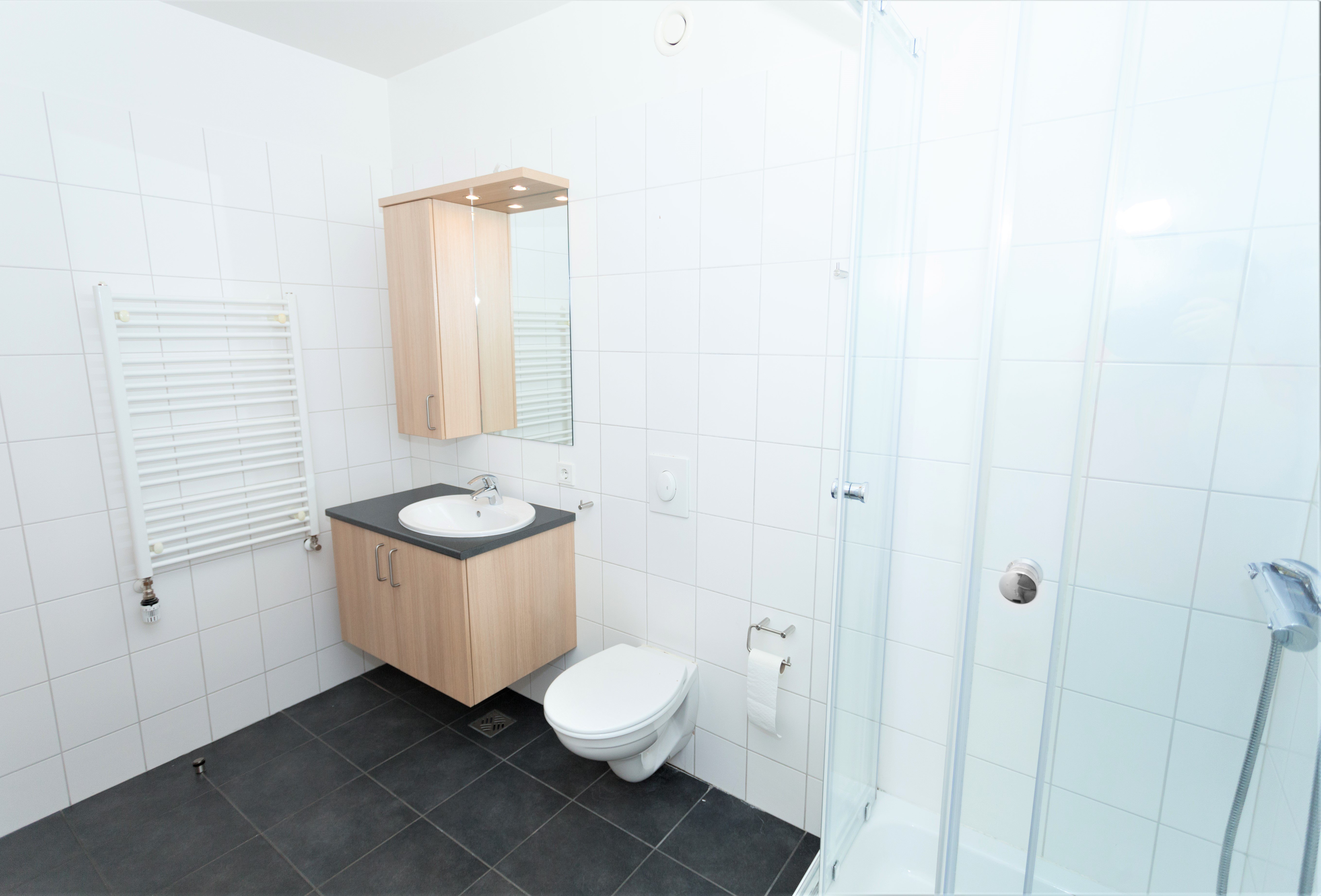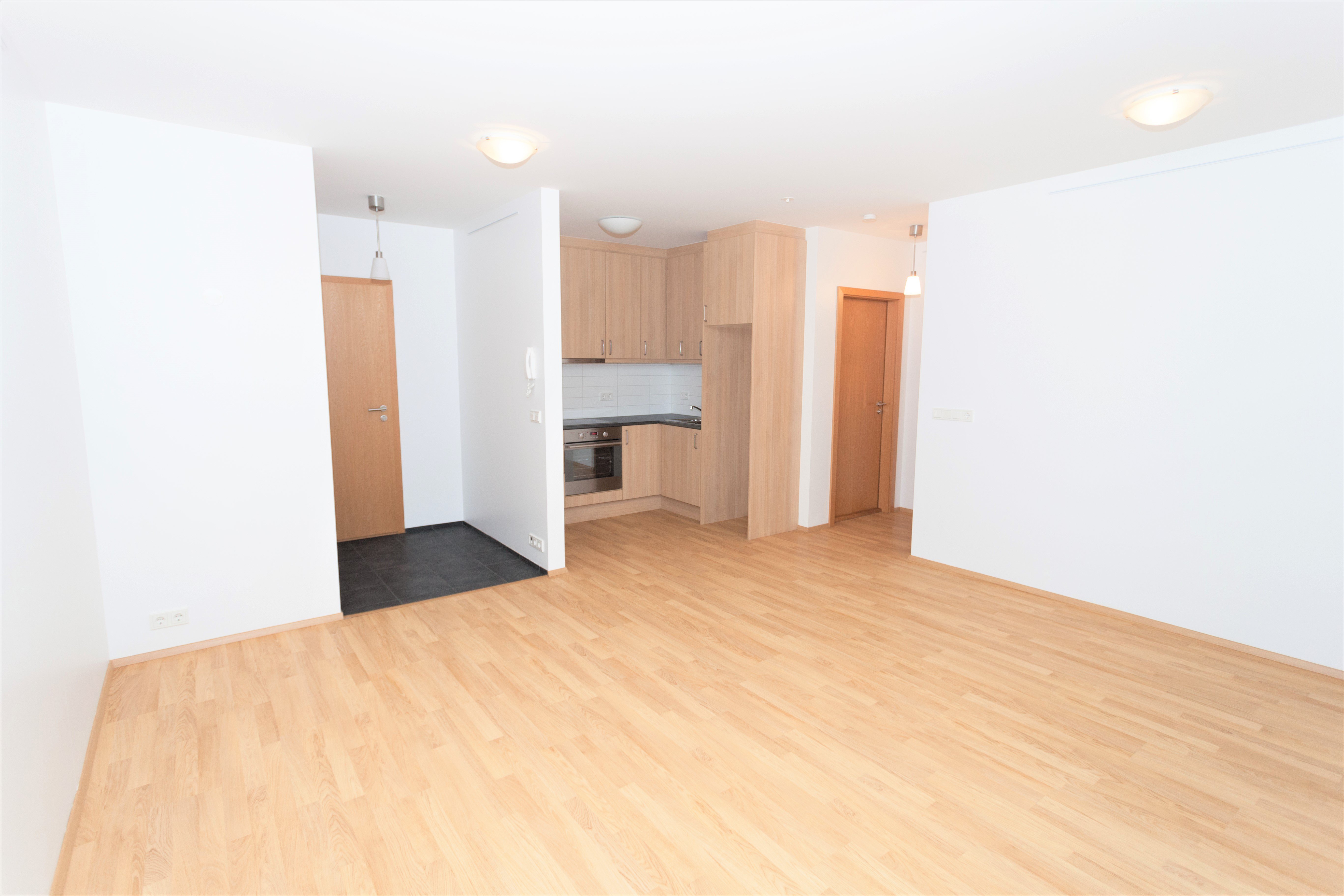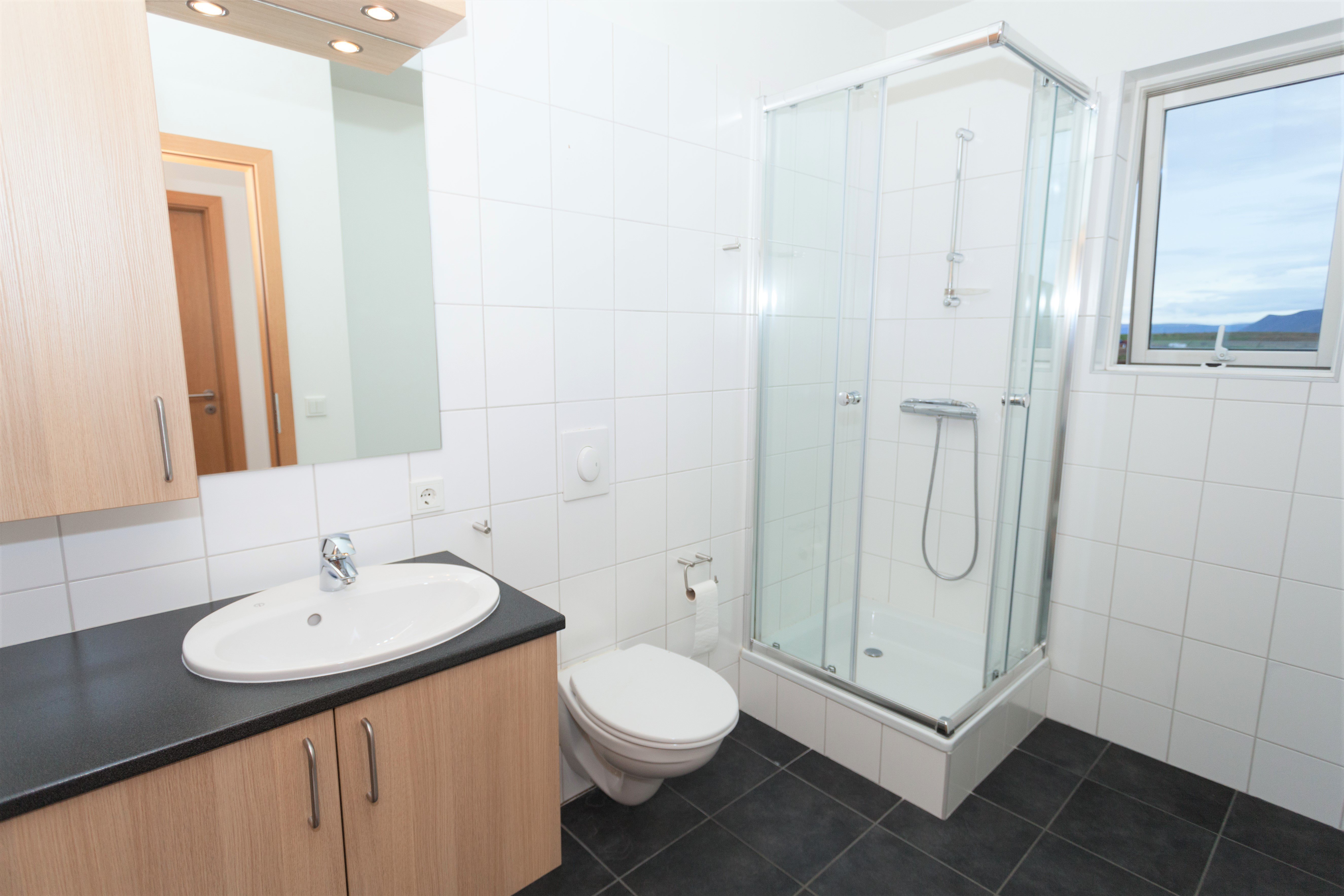 Íbúðin skiptist í eitt svefnherbergi með fataskáp, rúmgóða og bjarta stofu með samliggjandi eldhúsi og baðherbergi með sturtu og tengi fyrir þvottvél.