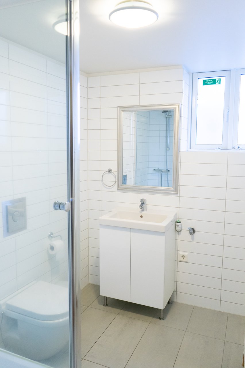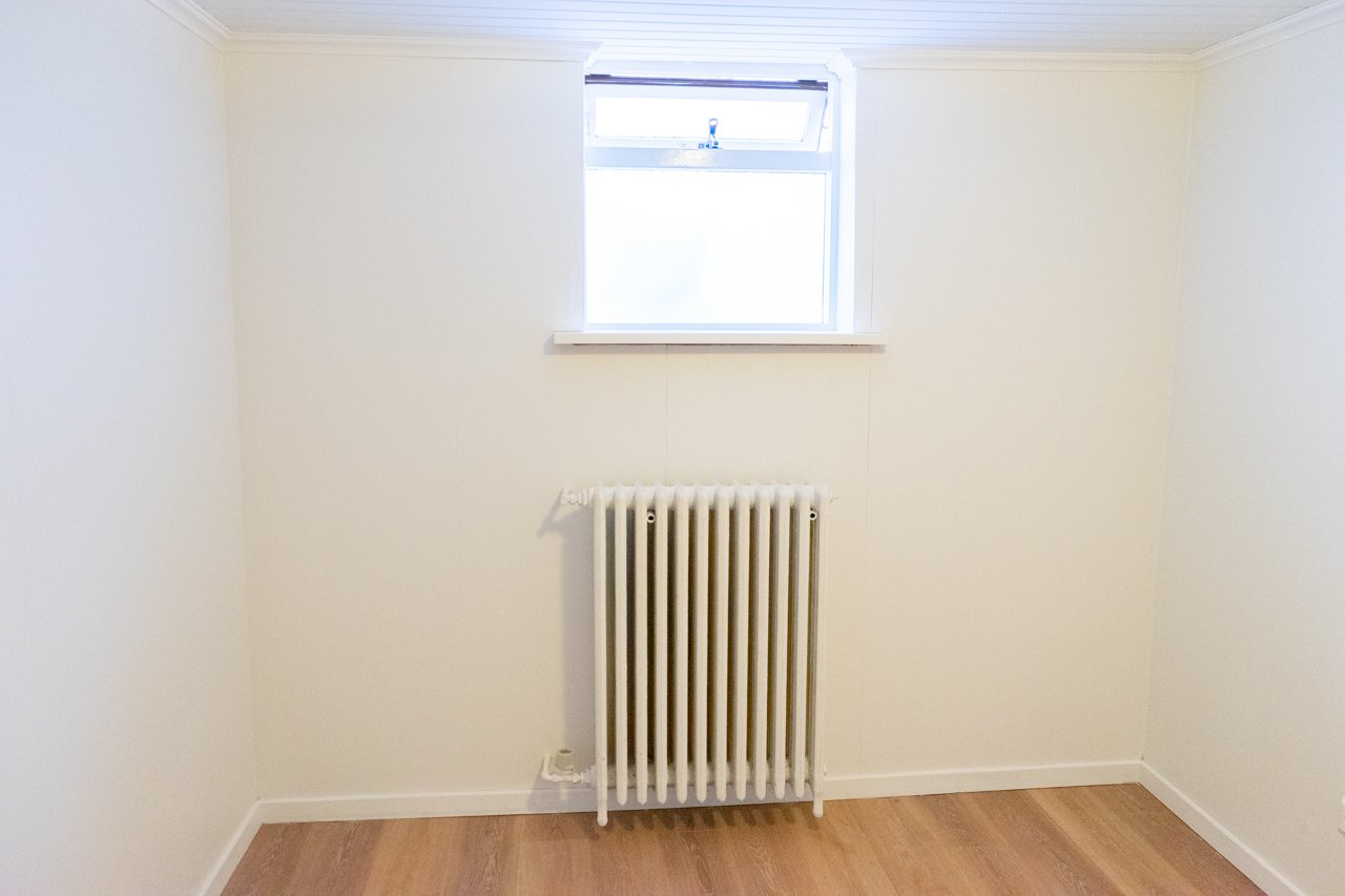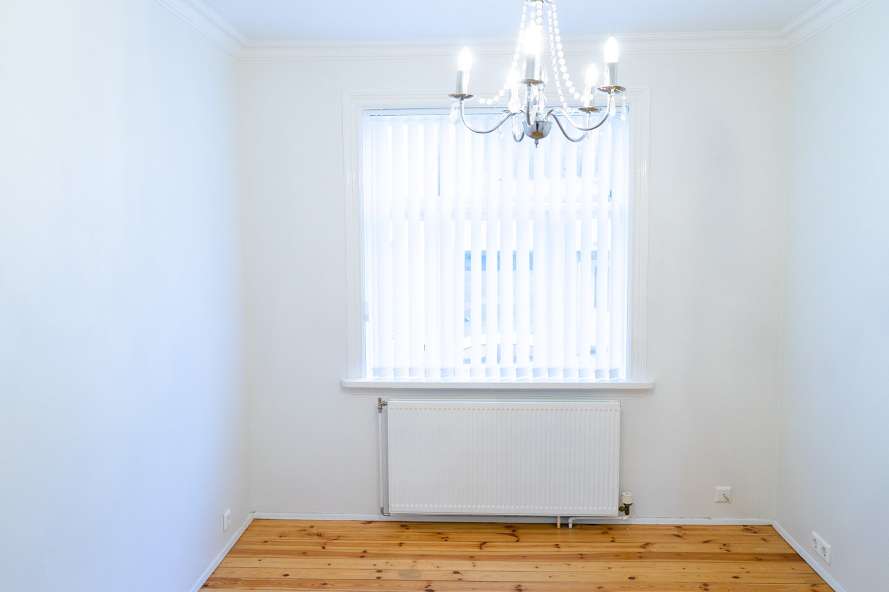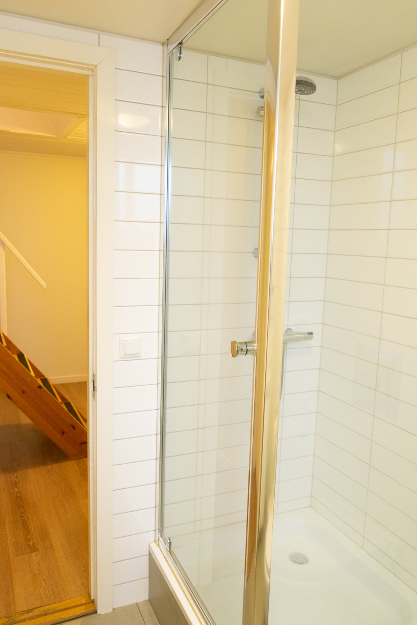 Á neðri hæð hússins eru tvö rúmgóð svefnherbergi og flísalagt baðherbergi með sturtu og tengi fyrir þvottavél. Parket er á gólfum.