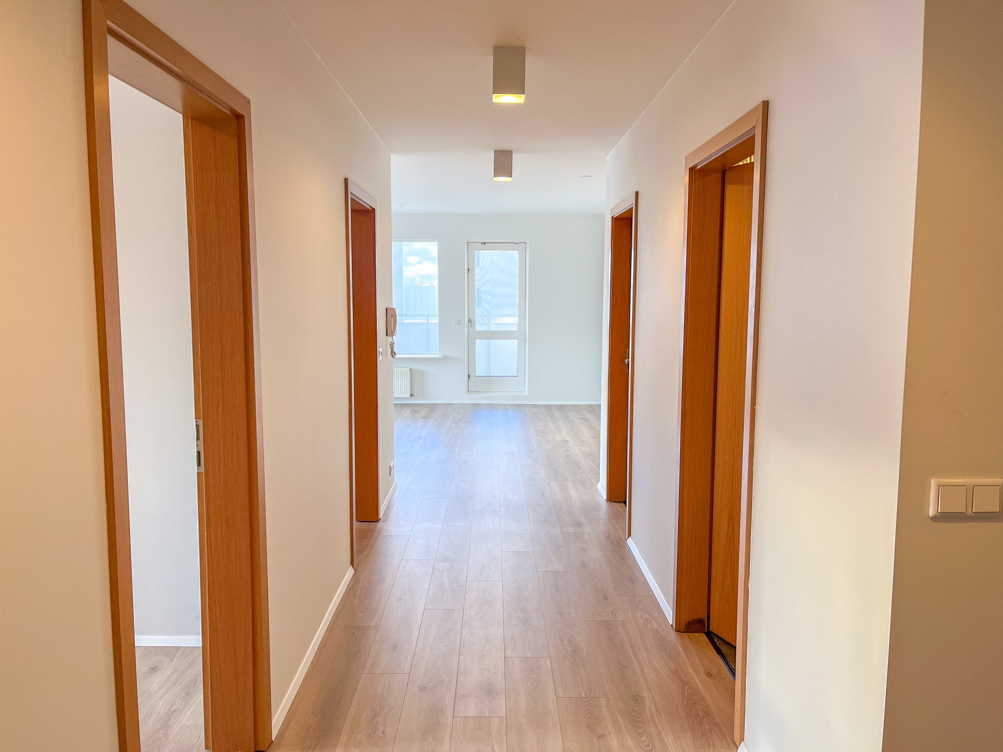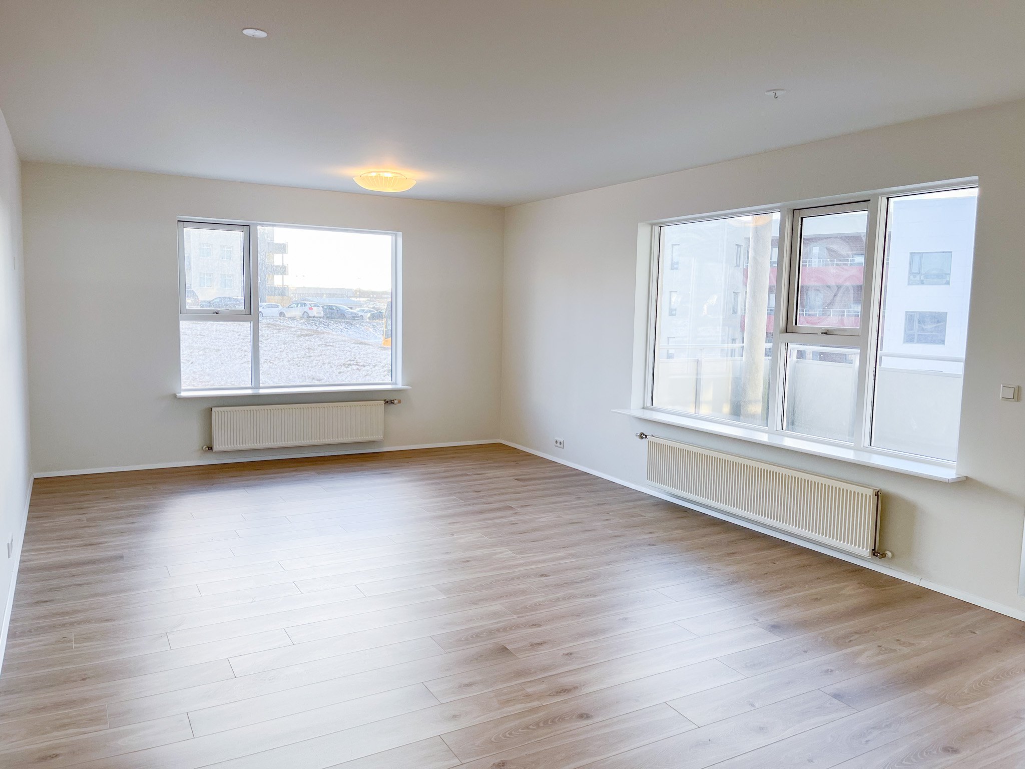 Íbúðin skiptist í forstofu með fataskáp, bjarta og opna stofu, eldhús með snyrtilegri innréttingu, þrjú svefnherbergi með fataskápum, þvottaherbergi og baðherbergi með sturtu og baðkari.