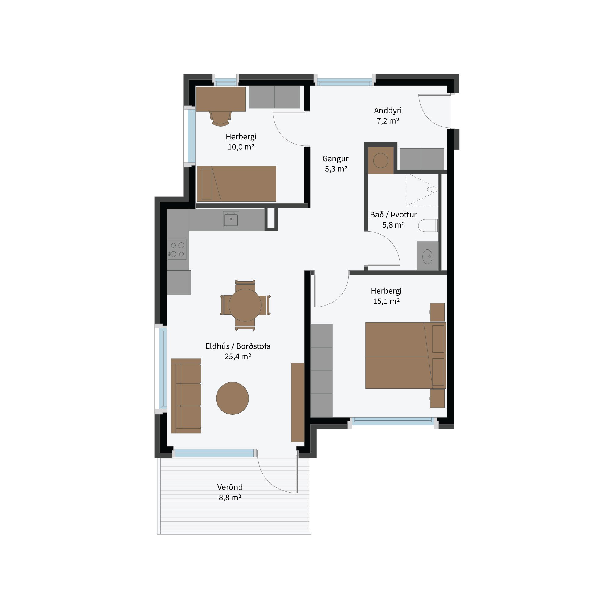 Eldhús og stofa í sameiginlegu rými, 25,4 fm þar sem gengið er út á 8,8 fm verönd.