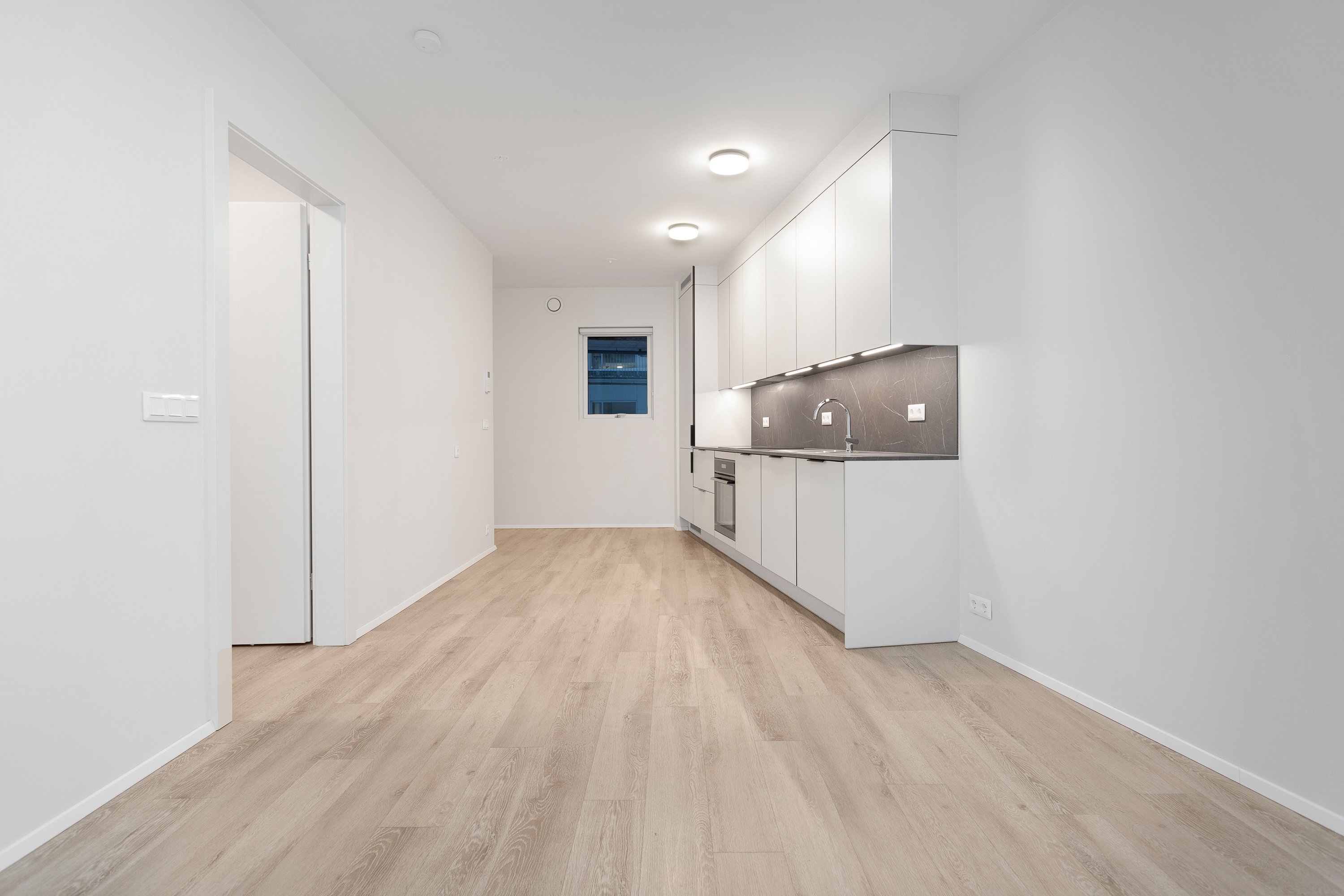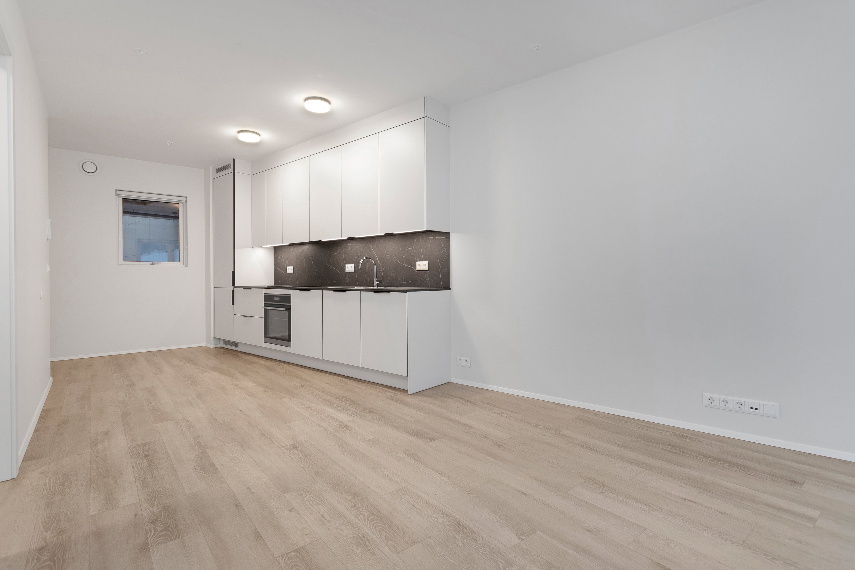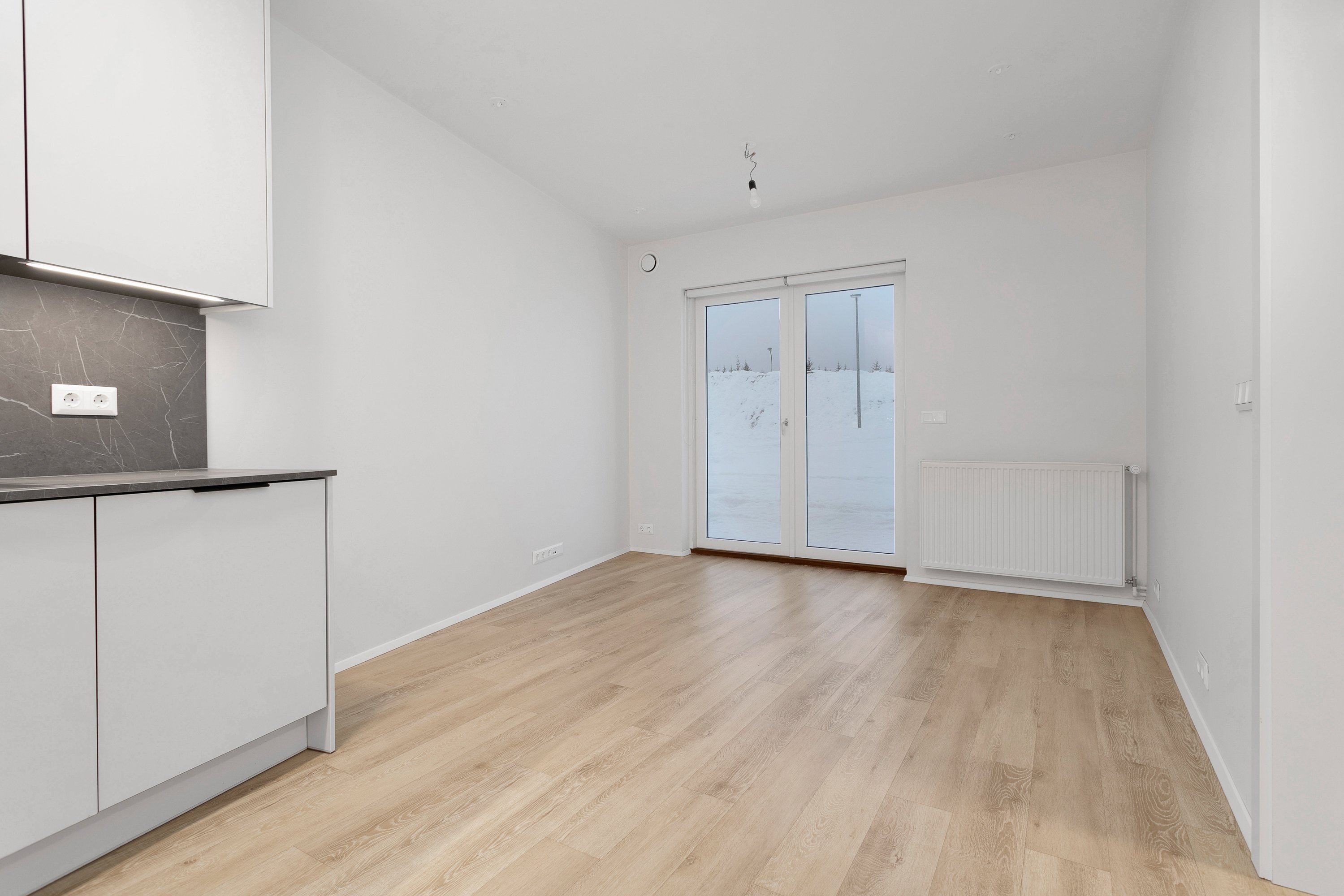 Eldhús og stofa í sameiginlegu rými, 21 fm þar sem gengið er út á góða verönd í norðvestur. Innbyggður ísskápur og uppþvottavél er í eldhúsi. Frá stofu er gengið inn í svefnherbergi, 10 fm með góðu skápaplássi. Parket er á gólfum. Íbúðin er leigð út með gardínum í gluggum.