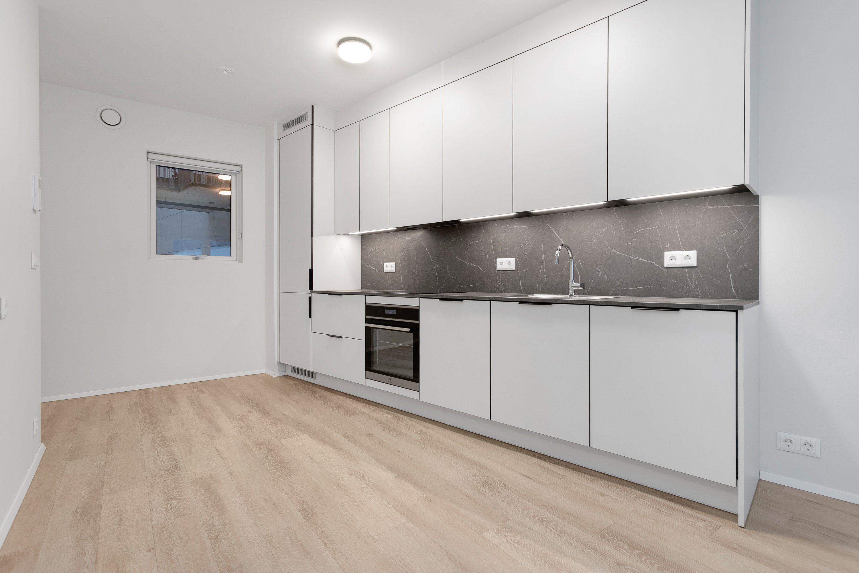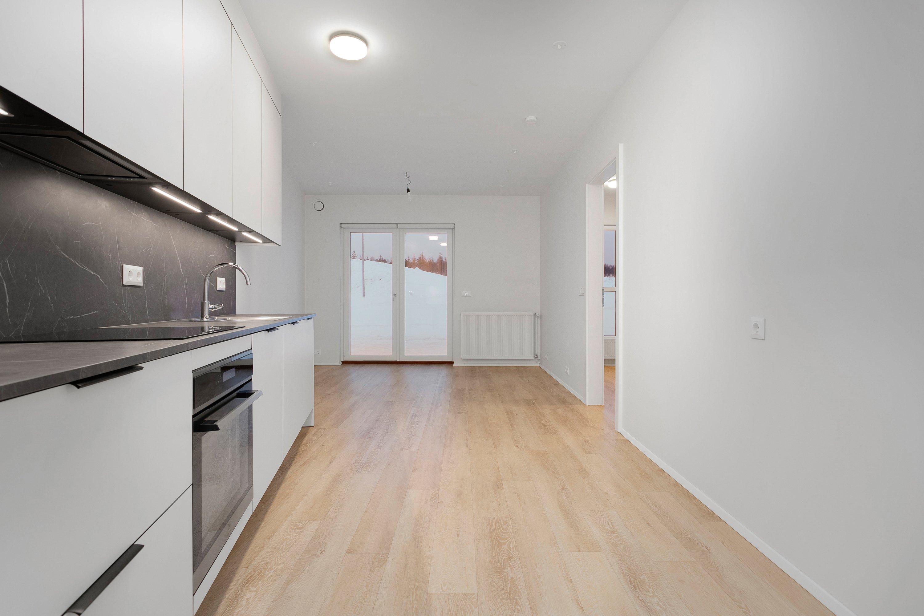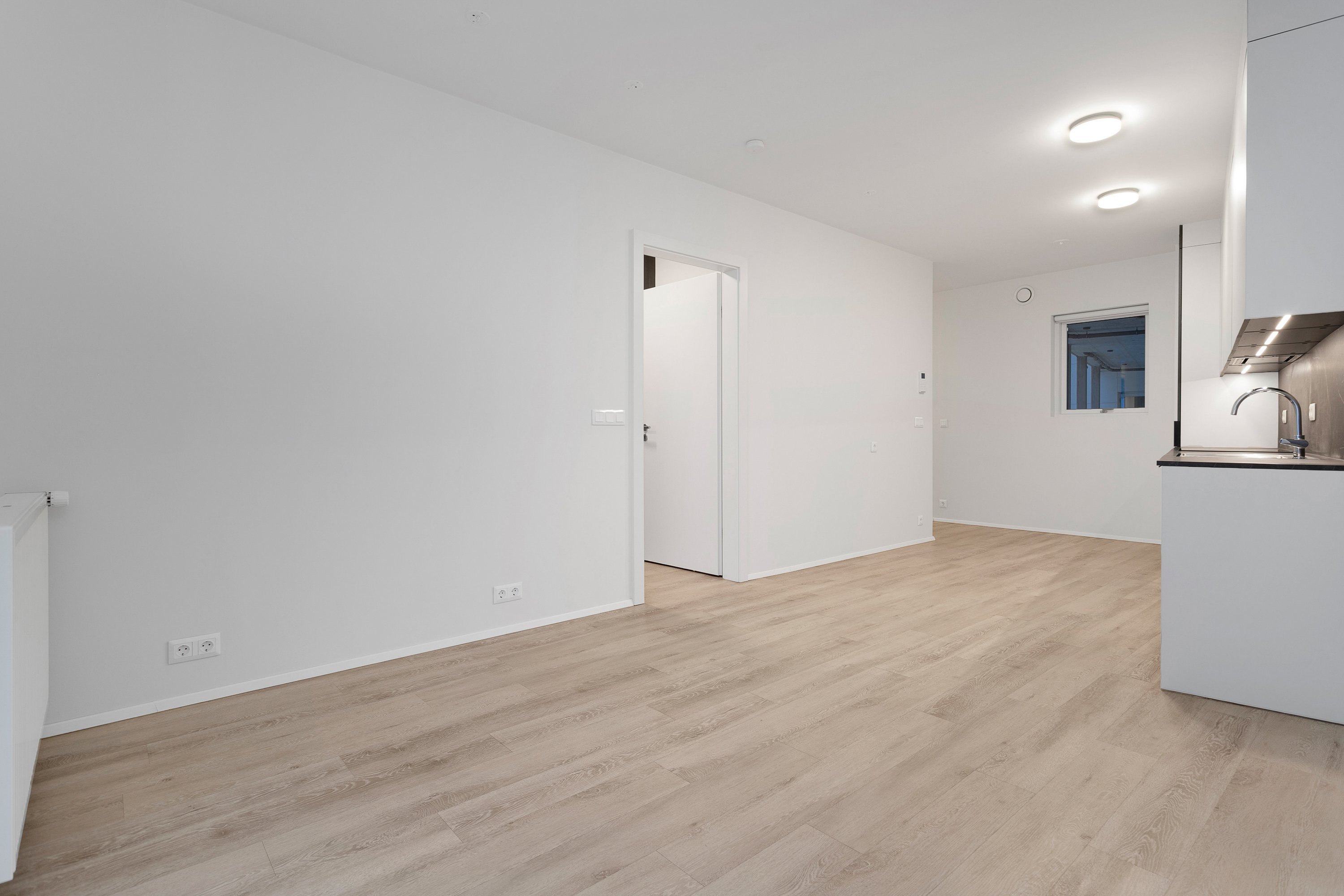 Eldhús og stofa í sameiginlegu rými, 21 fm þar sem gengið er út á góða verönd í norðvestur. Innbyggður ísskápur og uppþvottavél er í eldhúsi. Frá stofu er gengið inn í svefnherbergi, 10 fm með góðu skápaplássi. Parket er á gólfum. Íbúðin er leigð út með gardínum í gluggum.