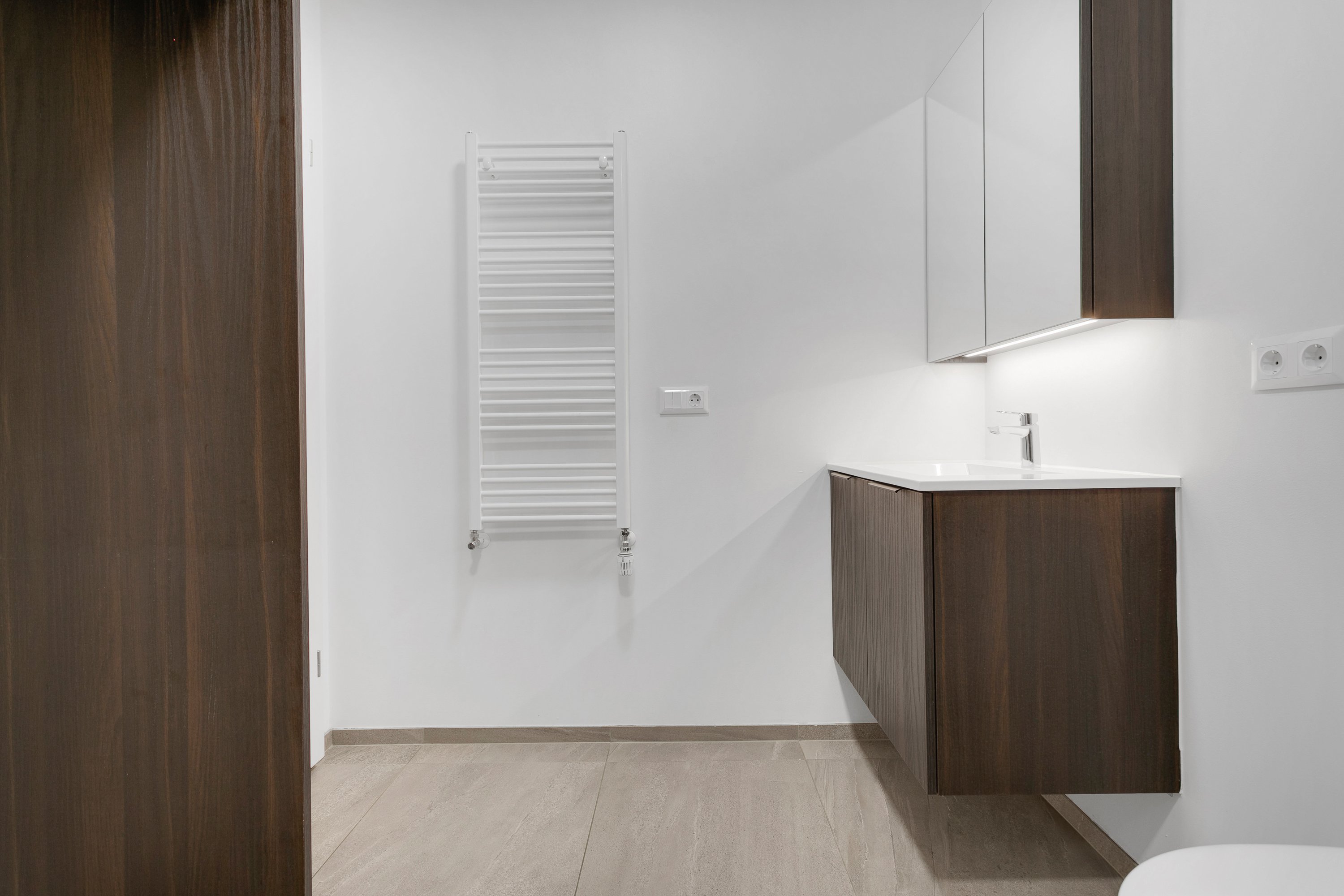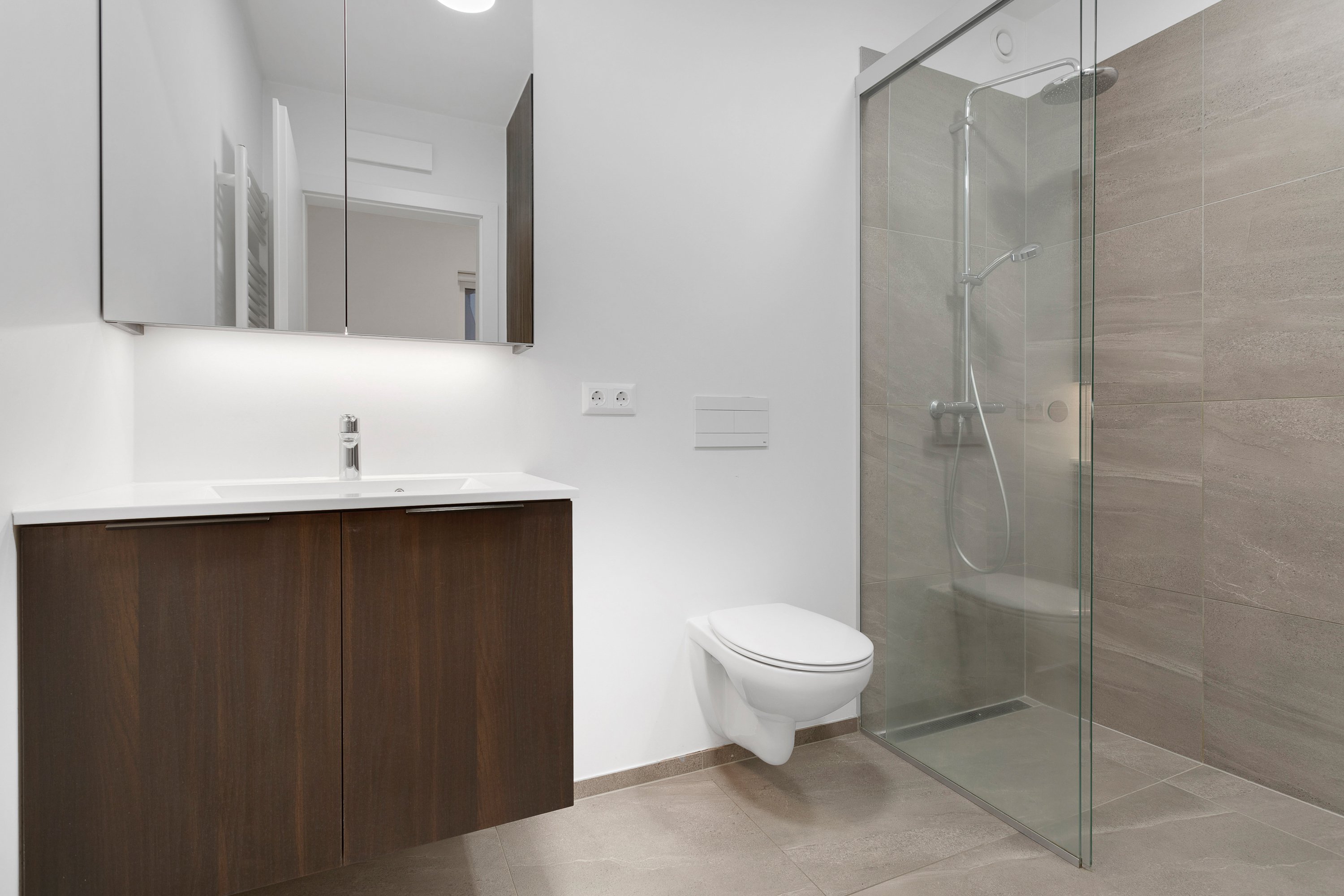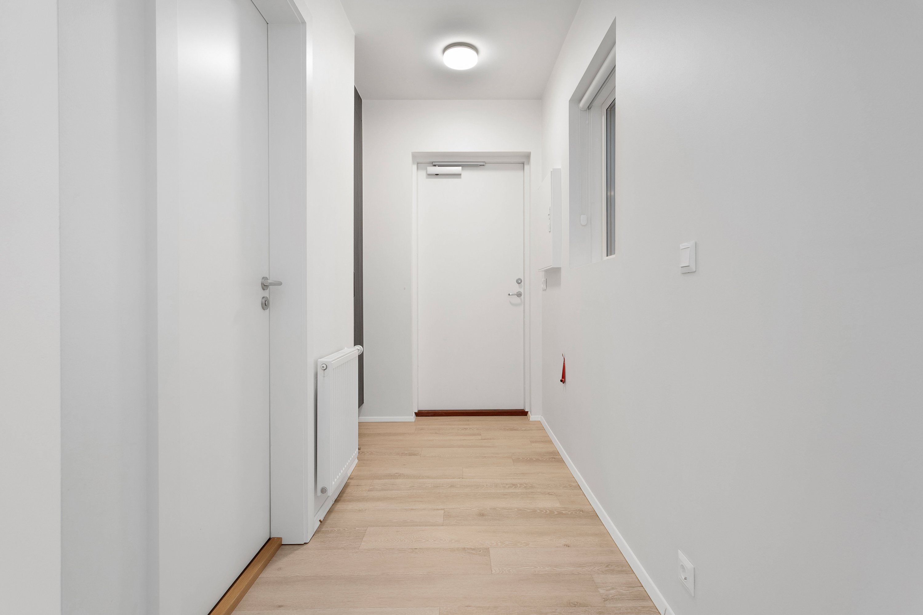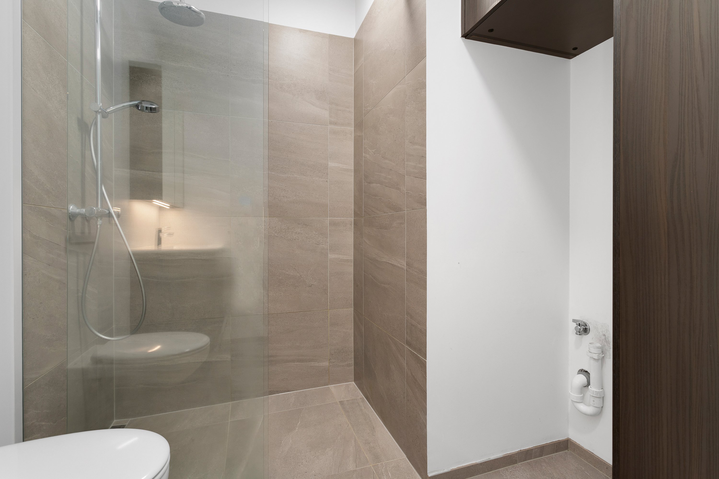 Gengið er inn í anddyri með góðum fataskáp. 5 fm baðherbergi með flísum á gólfi og góðri sturtu. Tengi fyrir þvottavél og þurrkara.