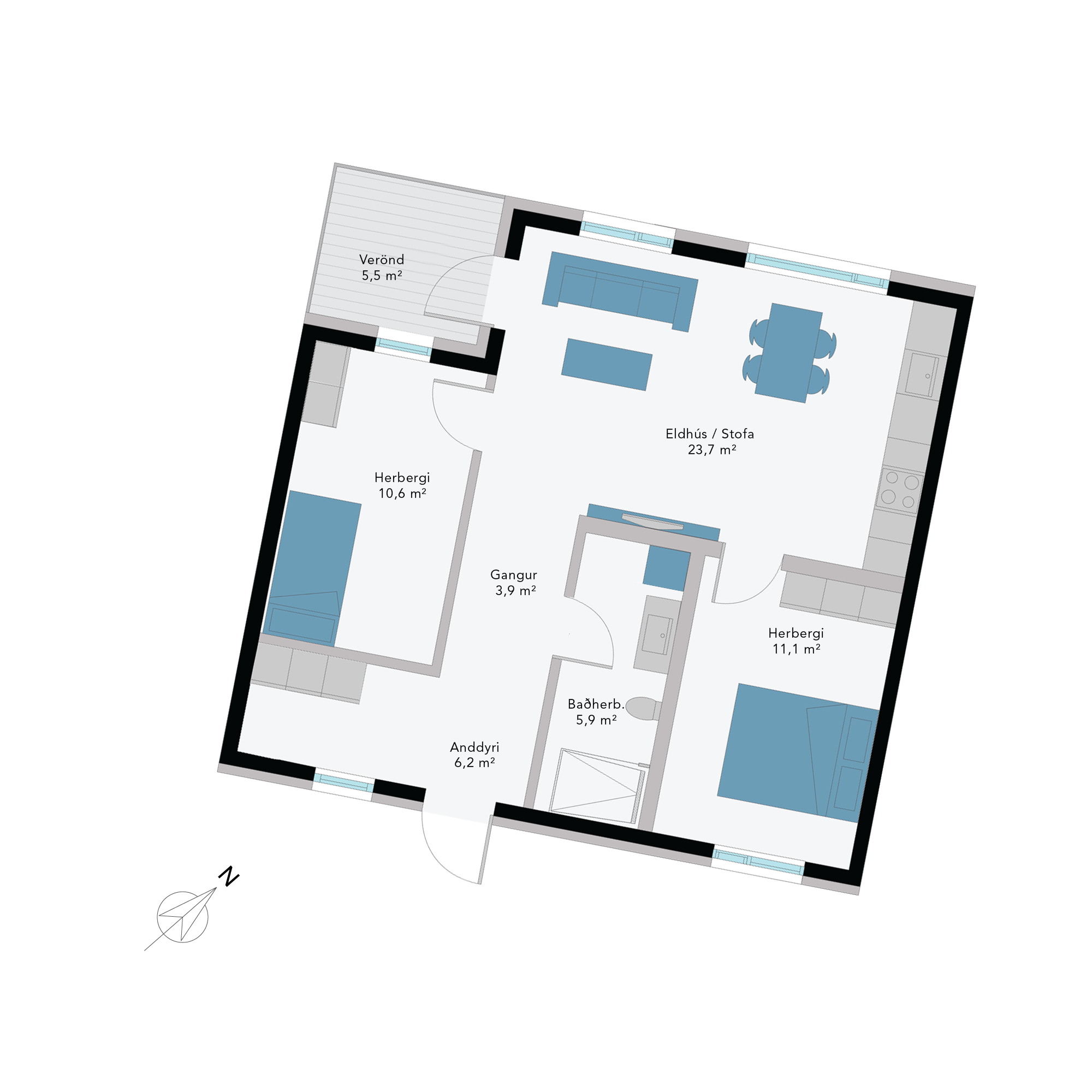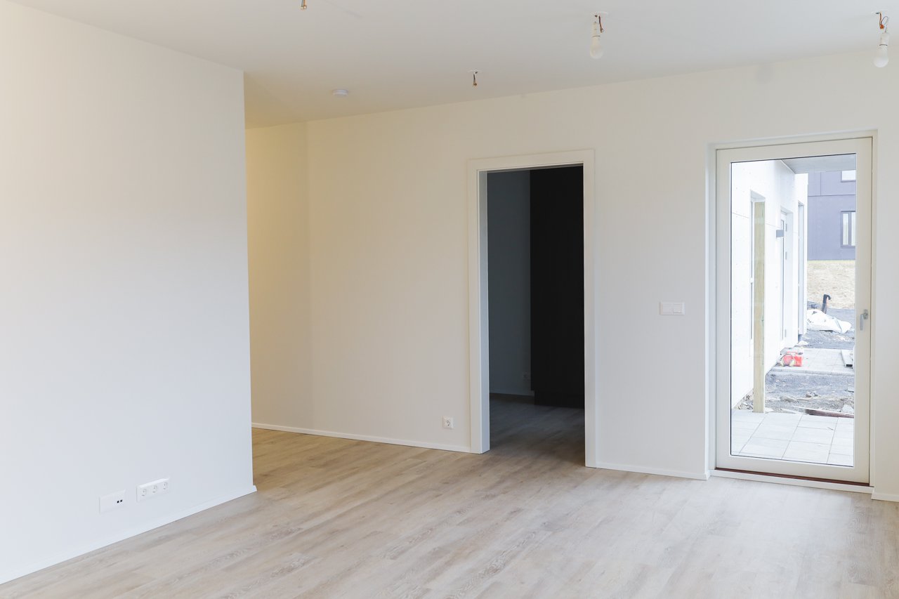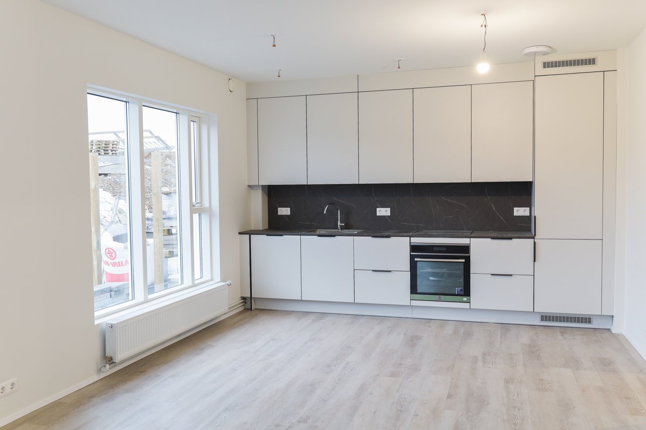 Eldhús og stofa í sameiginlegu rými, 24 fm þar sem gengið er út á 5,5 fm verönd sem snýr í vestur. Innbyggður ísskápur og uppþvottavél er í eldhúsi.