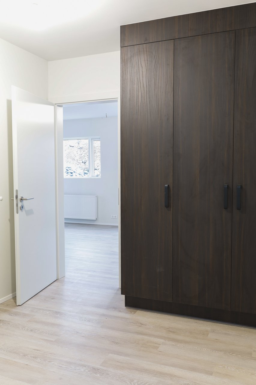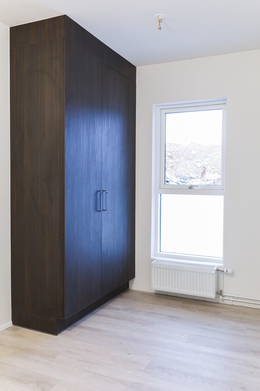 Frá stofu er gengið inn í tvö svefnherbergi, 10 og 11 fm með góðu skápaplássi í báðum herbergjum. Íbúðin er leigð út með gardínum í gluggum.