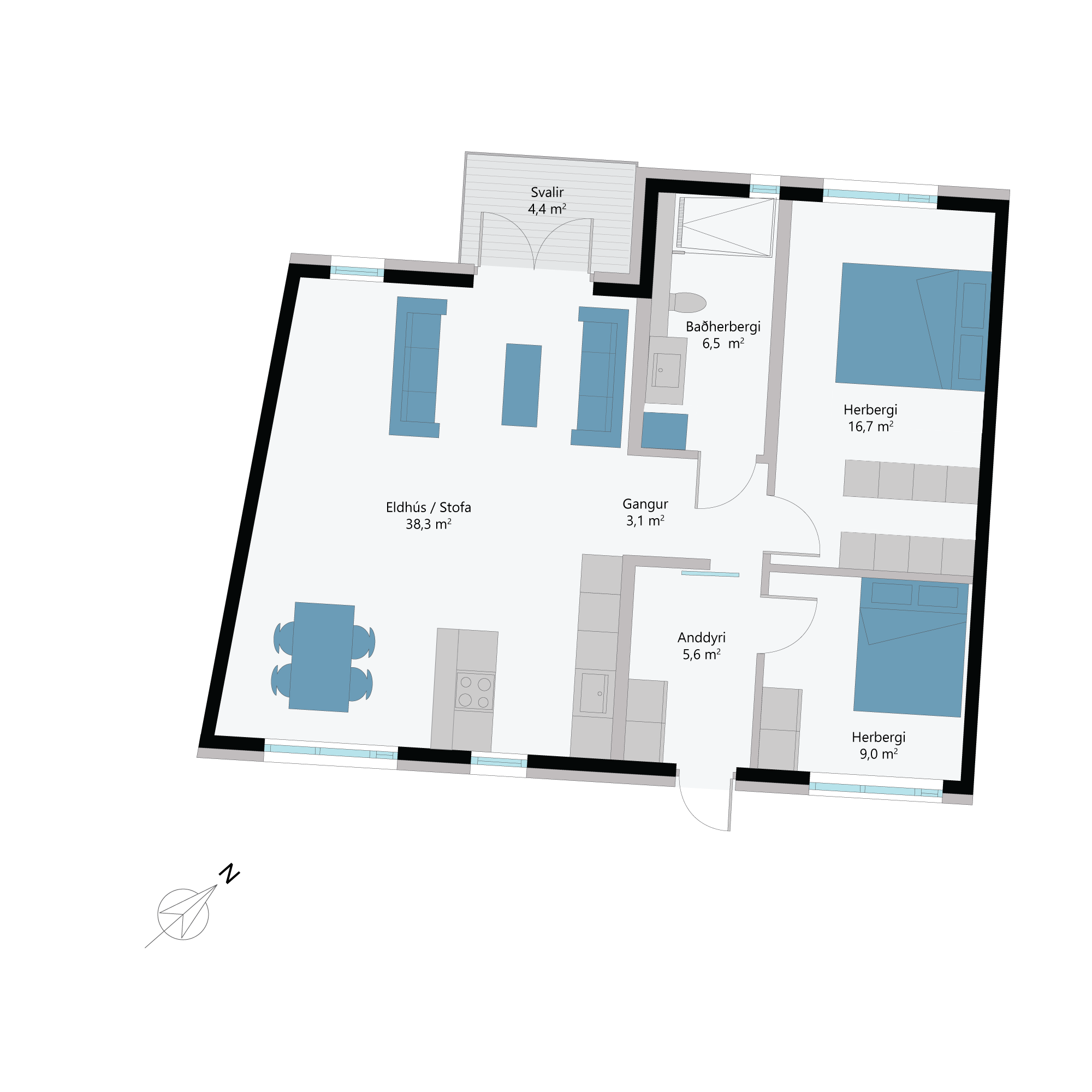 Gengið er inn í anddyri, 5,6 fm með stórum og góðum fataskáp. Á hægri hönd eru tvö svefnherbergi, 9 fm og 16,7 fm með góðu skápaplássi í báðum herbergjum.