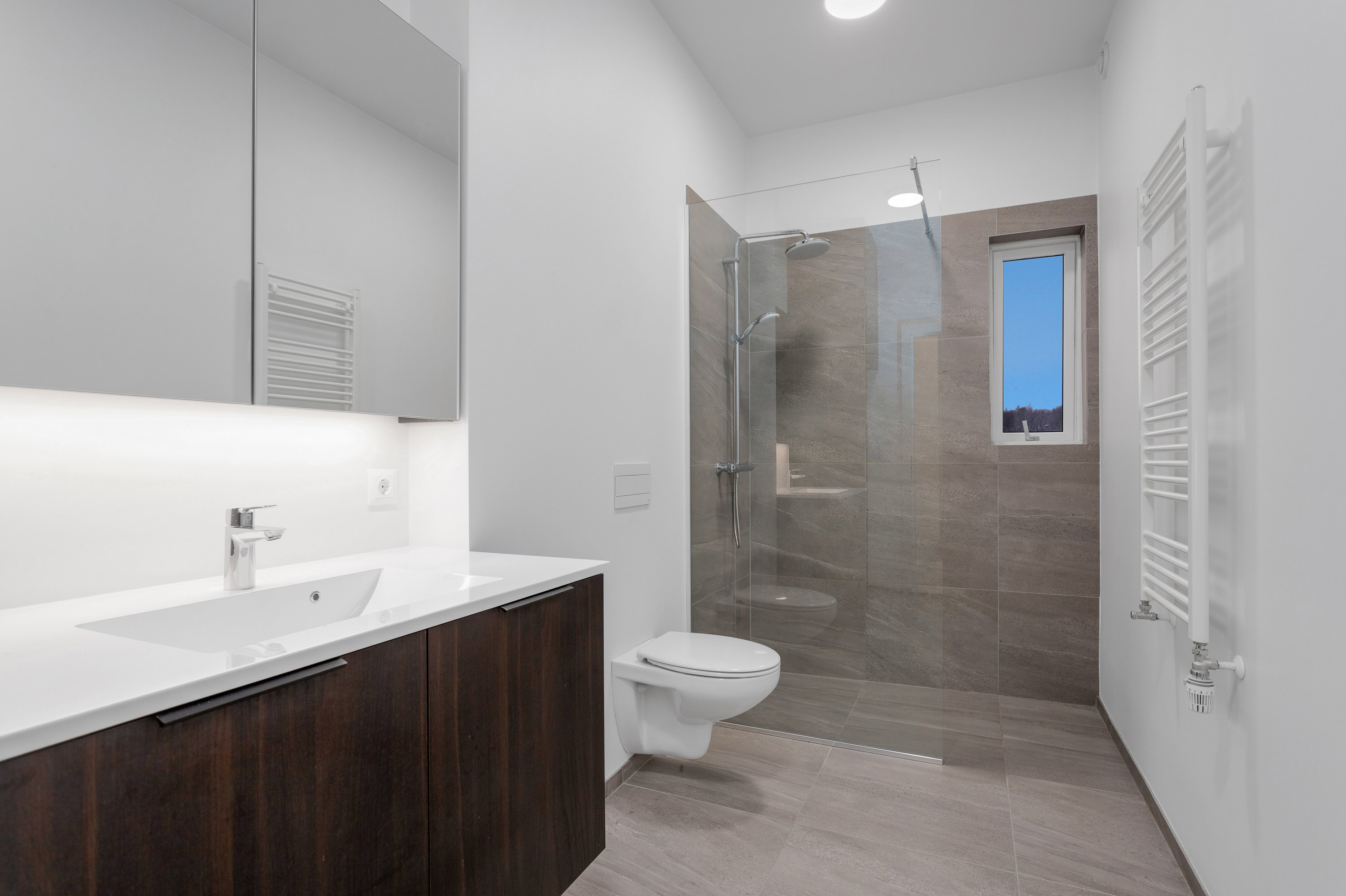 6,5 fm baðherbergi með flísum á gólfi og góðri sturtu. Tengi fyrir þvottavél og þurrkara.