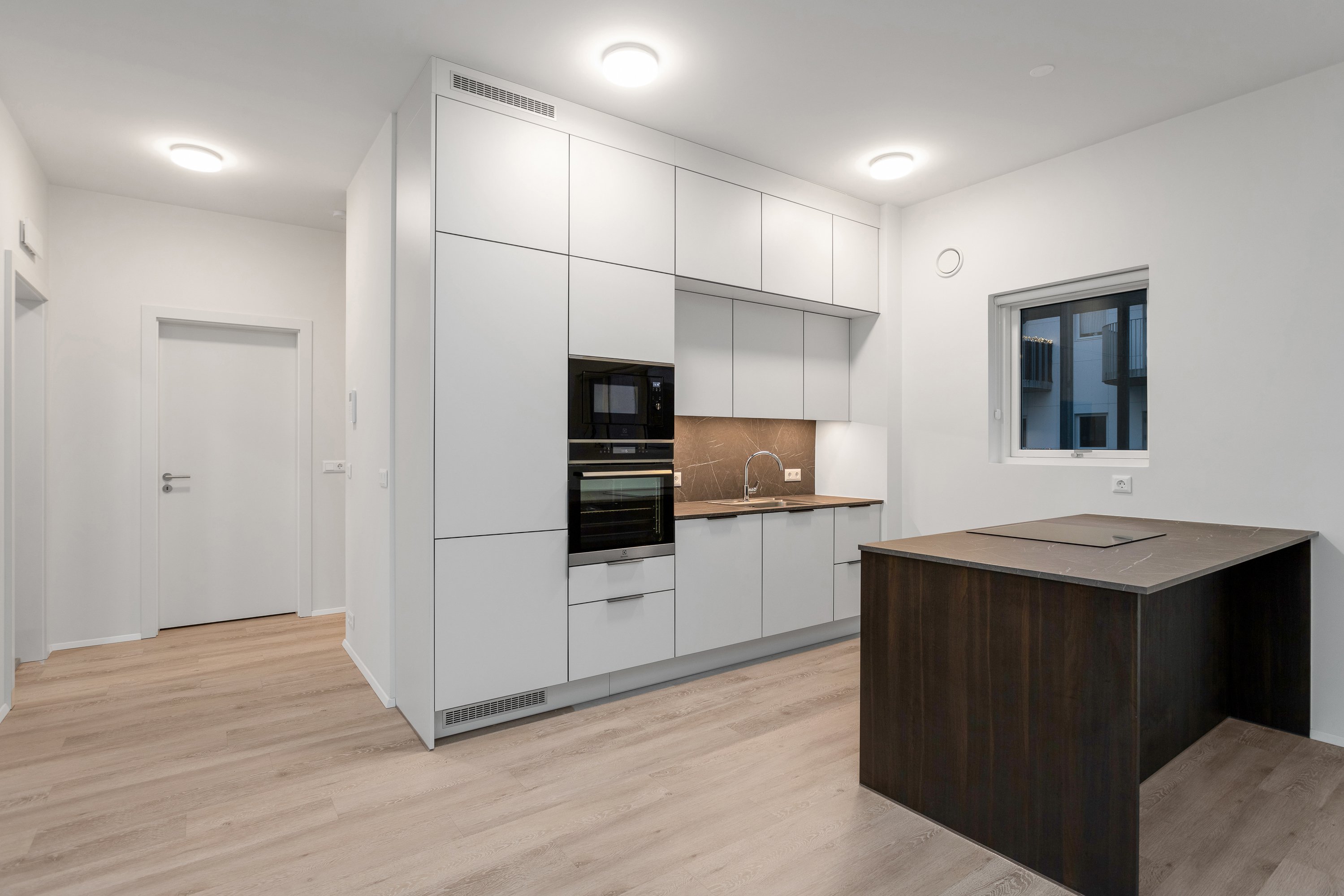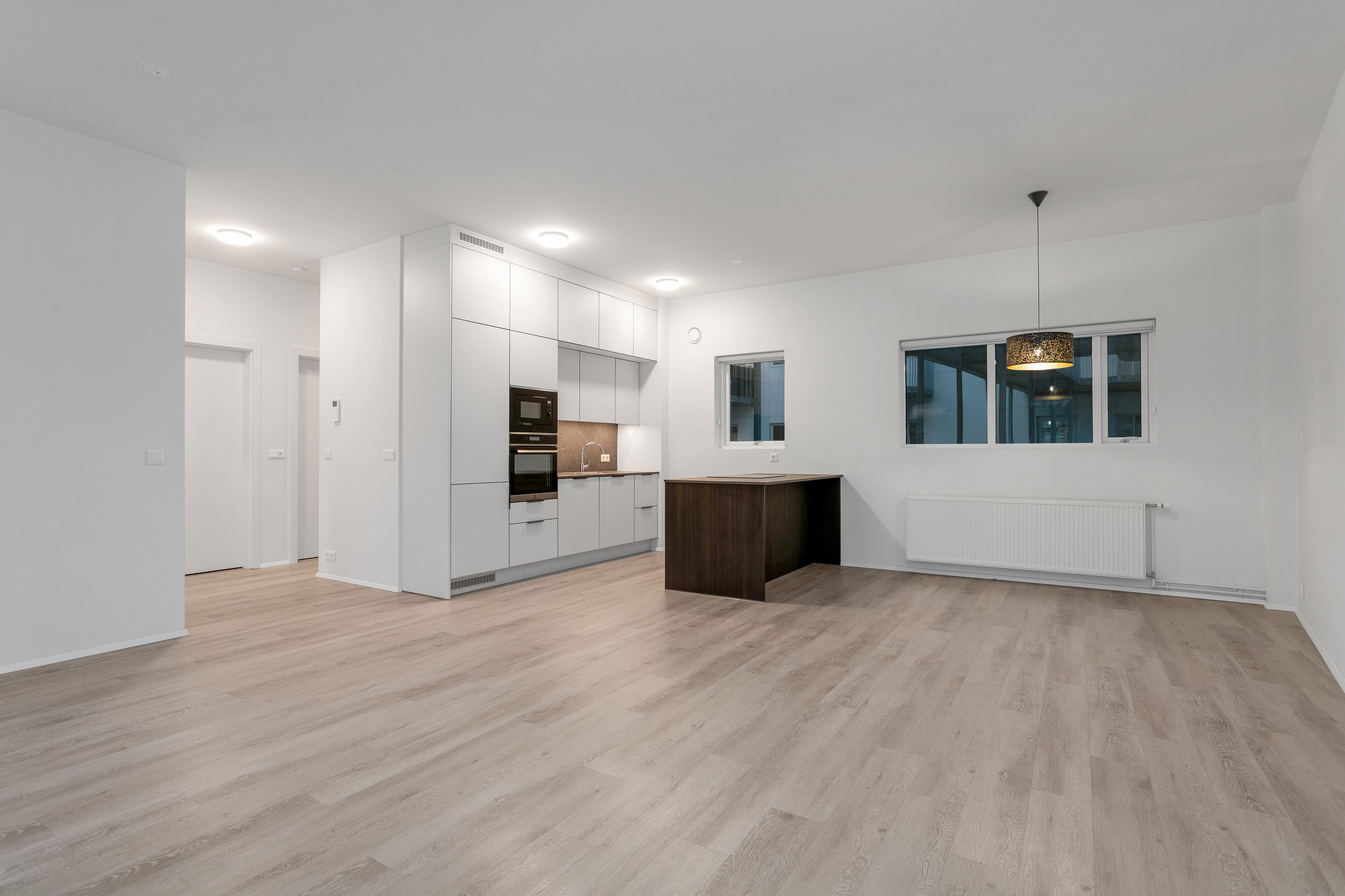 Eldhús og stofa í sameiginlegu rými, 38,3 fm þar sem gengið er út á 4,4 fm svalir sem snúa í vestur. Innbyggður ísskápur og uppþvottavél er í eldhúsi.